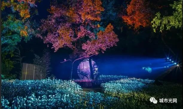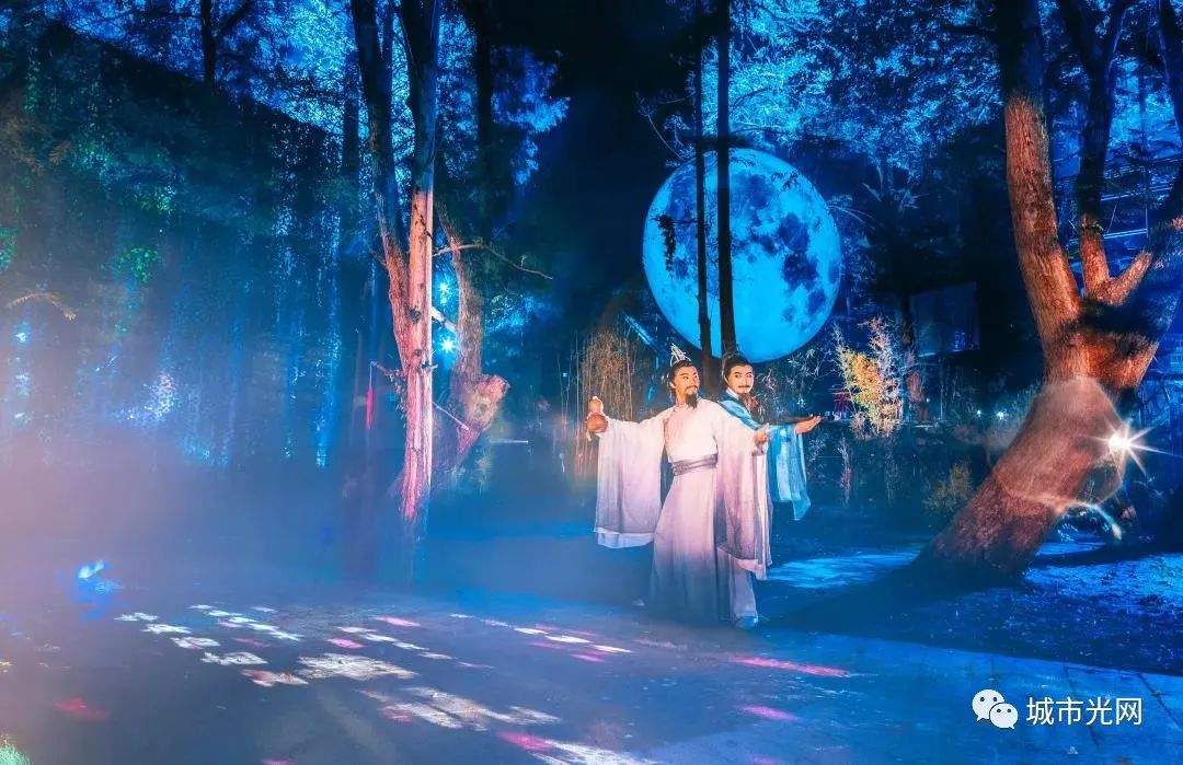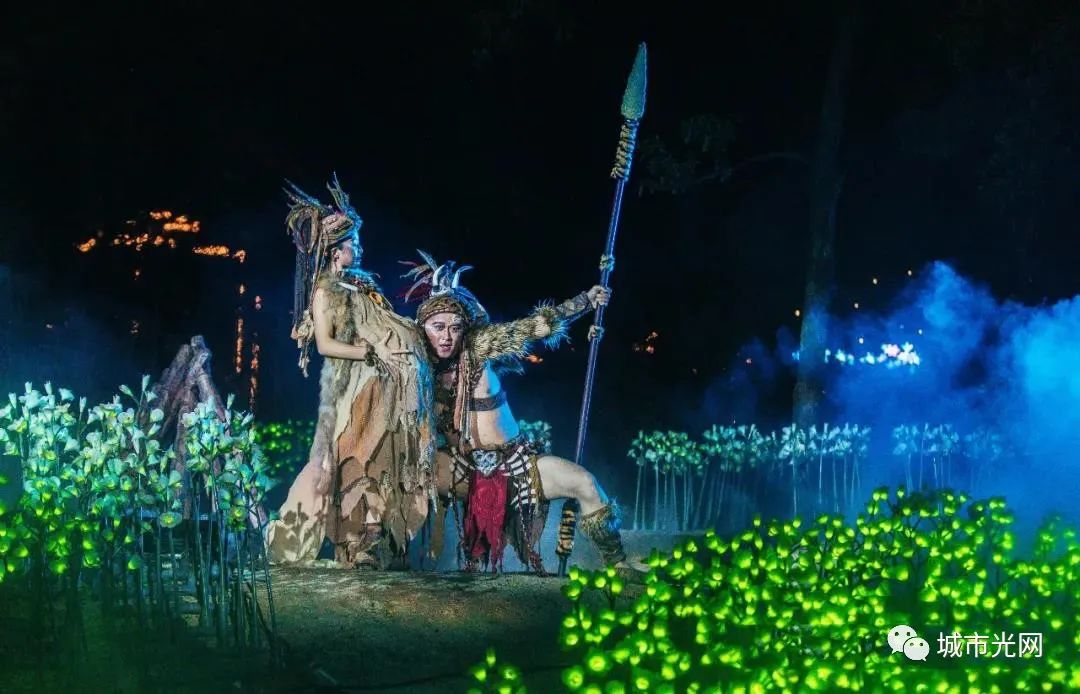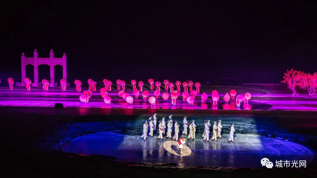演出中,广阔的五色发光花海、光雾时空隧道,有江景、雨帘、树木、鸟群,战场火光、漫天星光、电闪雷鸣与演员、自然环境融为一体,带观众游历一个绝美的超现实世界。