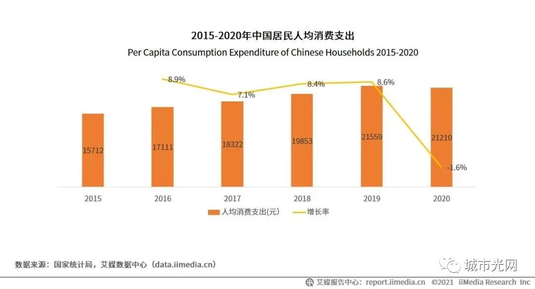数据显示,2015-2019年中国居民人均消费支出保持逐年递增的趋势。2020年在疫情的影响下我国居民人均消费有所下滑,全国居民人均消费支出21210元,比上年名义下降1.6%,下滑幅度较小。分析师认为,中国居民人均消费支出与消费意愿的提高为夜间经济的发展奠定了潜在的经济基础。