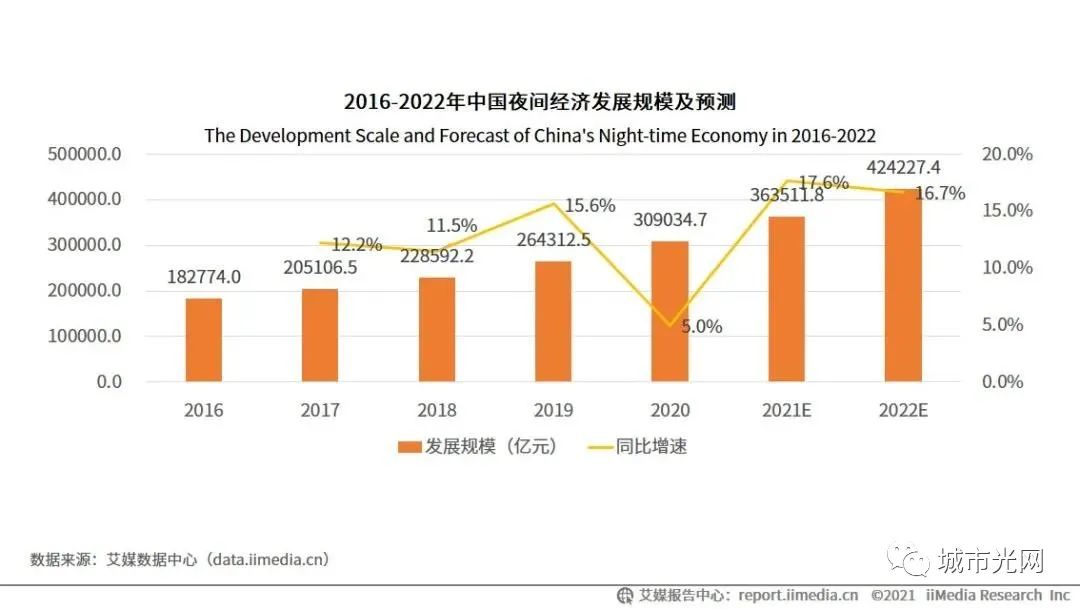 数据显示,2016年以来,中国夜间经济规模快速增长。截至2020年底,中国夜间经济规模突破30万亿元,较去年同期增长了5.0%,预计2022年将突破40万亿元。分析师认为,为了刺激消费,中国各地政府对夜间经济的扶持力度加大,同时,夜间消费场所的服务市场增加以及人们夜间消费需求的攀升,中国的夜间经济的发展规模将持续增长。