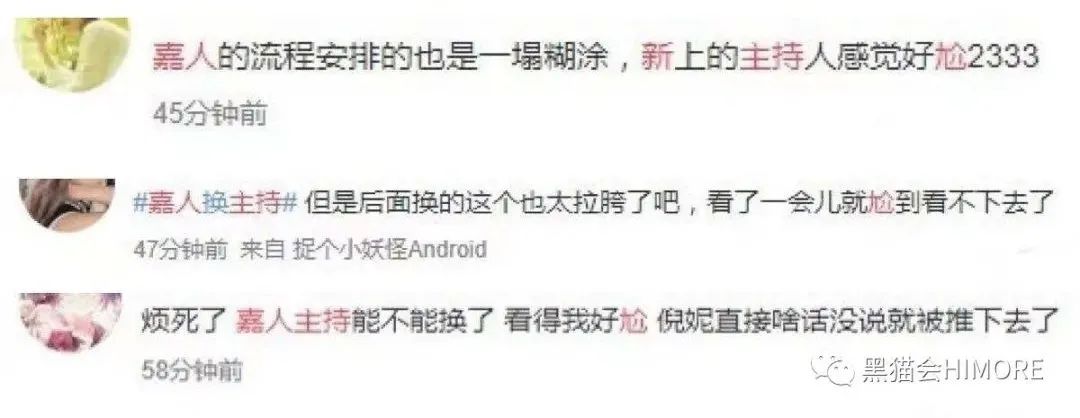 然后活动方让曾美慧孜(金像奖影后)做临时救场主持人,所以现在是,被换掉的李斯羽很尴尬, 救场的曾美慧孜因为主持不专业被吐槽也尴尬。