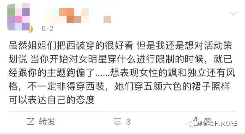 并且格局小在为什么表现女性独立、有影响力,就非得要穿西装呢?不是脱下礼服改穿西装就是女性独立了,有影响力了,用去女性化的形象特点来宣传独立,反过来不就是对男性形象特点的膜拜?