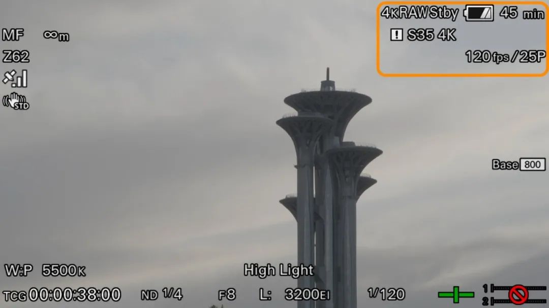 它的系统帧频在59.94P、50P、29.97P、25P、23.98P时都能够实现4K 120P,所以我们可以得到多种速度的慢动作,如果是59.94P和50P的系统帧频,就能得到2倍和2.4倍的升格,如果是29.97P和25P,对应就是4倍和4.8倍。