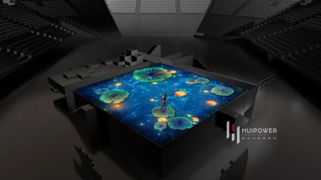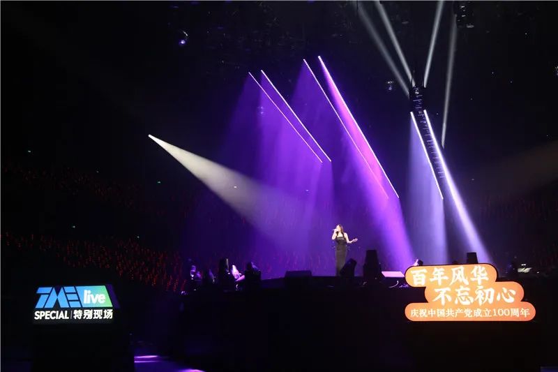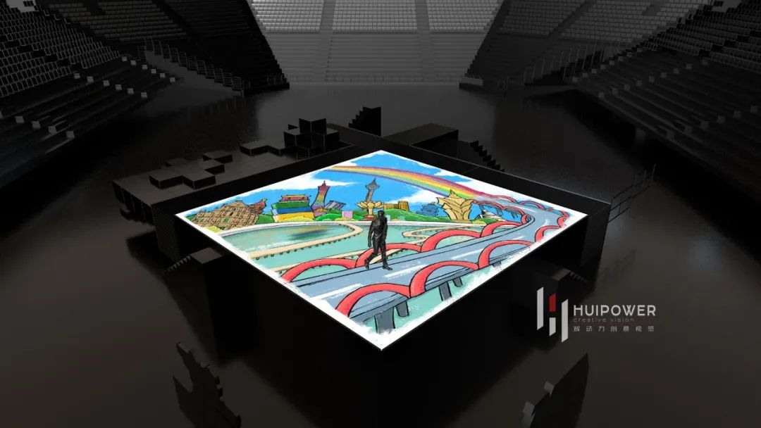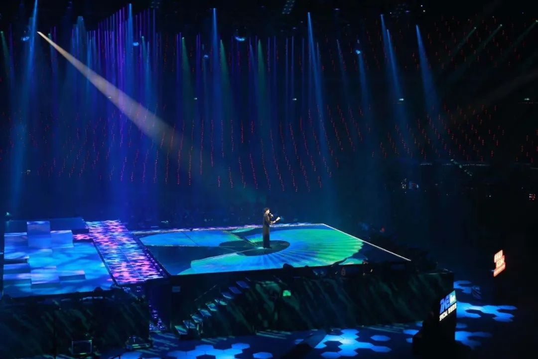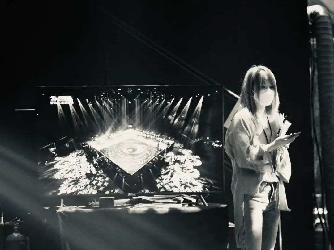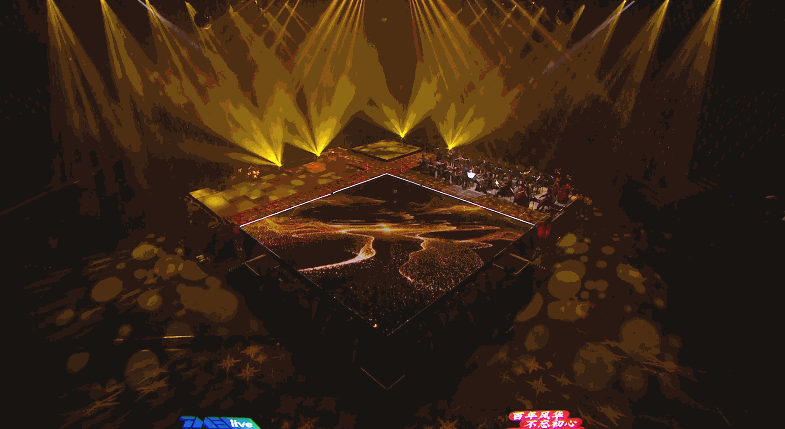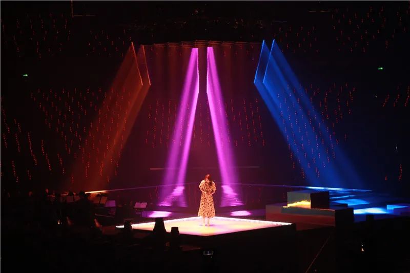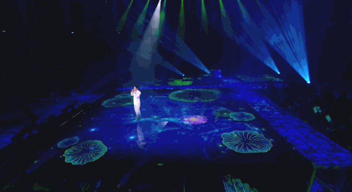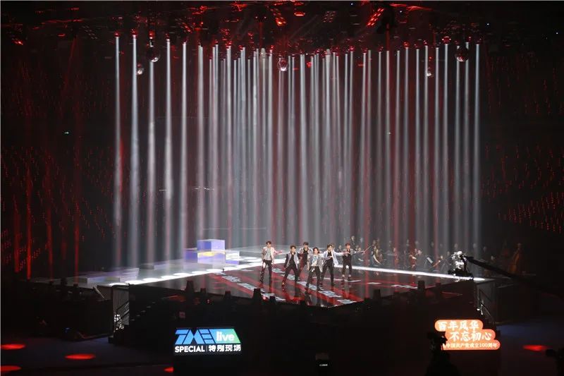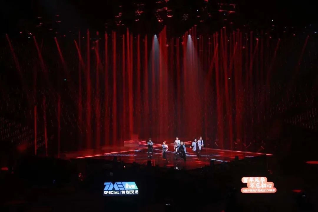 此次的主创团队来自大晶小怪导演工作室,这一次,在澳门,她们用怎样特别的方式为党100周年送上了这份守候与祝福?“既然是一场献礼,我们最初想到送给妈妈的‘礼物’(用精美的礼盒包装),如果能将这个礼物打造成一个特别的舞台(礼盒),通过不同的内容,把‘心意’‘惊喜’‘礼物’一层一层地剖开,这将会是一次很特别的制作。当我们接到青春歌会的时候,一方面时间非常有限,又因为场地设在澳门,还要涉及所有设备报关,执行压力非常大,为了能在短短一个月的时间里完成整场晚会,我们将想法与舞美、灯光、视频、音响等各个工种的团队沟通、讨论后,最终决定采用了四面台。”执行总导演吴珊表示。“四面台的设计可以提升舞台的想象空间,同时也突破了以往晚会(三面台)的常态。为了更形象地呈现礼盒的模样,我们通过礼盒红色的丝带(铁丝结构+灯光效果)将舞台划分成ABCD四个不同形态的表演区。通过运用地屏、灯阵和升降装置,为传统单一的舞台打造了多样性的表演,视觉设计上大量运用了“裸眼3D”的效果,希望能带给观众不一样的体验和记忆。”A舞台设置了3组数控升降+灯架,B舞台采用了特别的带镭射效果的盒子,为了区别其它三个舞台,C舞台是一个4x4米的方形舞台,D舞台则是交响乐团的表演区域,四个舞台根据不同的每个歌曲、故事演绎,为观众、为党献礼。“因为是建党100周年,整场晚会围绕着‘百年风华 不忘初心’的立意,为每首歌曲的诠释都做了特别的设计,还包含了国风歌曲的演绎。《莲花与彩虹的约定》将濠江中学送给习主席的画融入到视觉中。通过每一个孩子的表演来立意祖国未来的欣欣向荣:合唱队唱响祖国山河,BOY STORY唱跳彰显活力,澳门小朋友王心妤,用童声演绎对祖国美好的祝福。”北京辉动力负责了整体的视觉设计。在刘惜君《光》这首歌曲的前半段,地屏上描绘了流动的可视化光线,后半段通过裸眼3D的设计,将“光”字的笔划进行解构拆分,漂浮的笔划最终在地屏上组合形成一个完整的悬浮“光”字,视觉效果极其震撼。胡夏《悠悠岁月 》利用地屏的空间优势,用各种意象元素生动地描绘了一幅静谧的荷塘景色。许嵩《燕归巢》 用写意风格的元素解构重组在地屏上设计出山水意境的裸眼3D视觉效果。