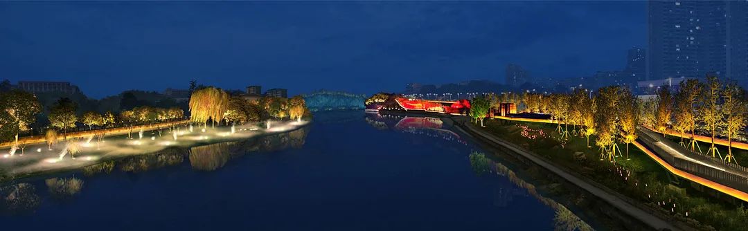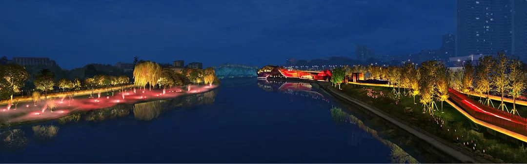 灯光不着重体现岸线,主要体现植物及构筑物层次,局部增加灯光载体,从而形成丰富的水中倒影。