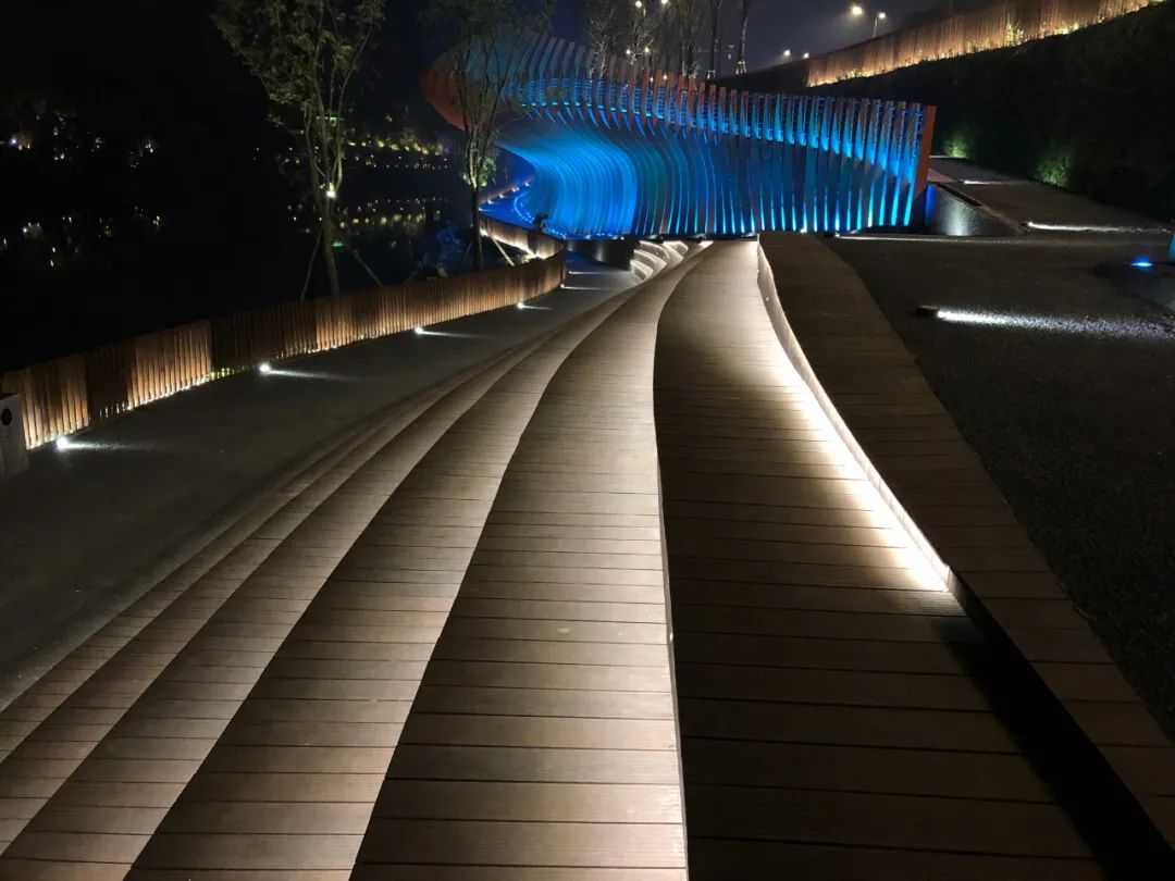 4.对局部景石进行单独照明。道路外侧增加发光地砖,起警示和点缀作用。