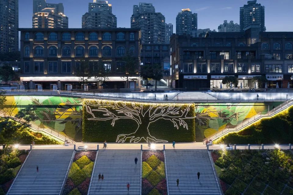 公园里的绿色墙和墙边的阶梯亮度明暗分明,给人的视觉上有很大的冲击性,以线型灯光融合树木造型而设计,而顶部延边与护栏采用线性洗墙。