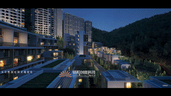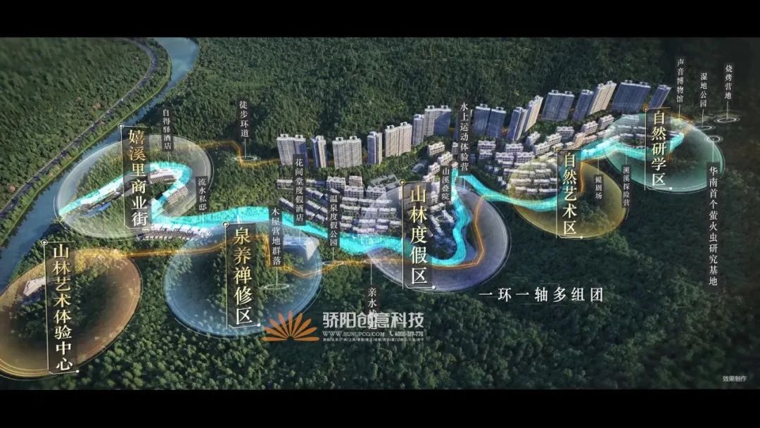项目抱山环水,藏风聚气的特点,被以光线描出,龙首、龙背、龙身、龙爪、龙尾……一环一轴多组团的空间架构被整体展示。