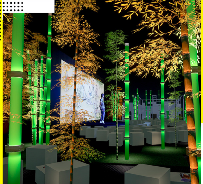《竹林论道》出自萨克斯演奏博士克莱蒙恩伯及编舞硕士黄则玄之手。克莱蒙对法国和中国文化有着深刻理解,而从事舞蹈艺术、作品创编和教学活动的黄老师则对空间、光线和节奏有着独特的精准感。该作品取自于魏晋的“竹林七贤”的典故,结合于中心论坛的程序仪式和活动,将光艺术品效果与实际论坛活动融合一起。在创作过程中,两位老师的独有经历都为作品注入了新活力。作品通过历史与现在、文化与传统、艺术科技与魏晋风骨的碰撞呈现出一种全新的艺术效果,还可延申叠加未来想像的K+未来光艺术。配合以缓缓流淌的音乐,作品呈现出美不胜收的魏晋风情,广州凯加未来科技有限公司董事长郭兆雄表示线上的作品展示还未能完全体现出其壮观与优美,其现场展出将有更加细节化的调整与呈现,值得大家期待。