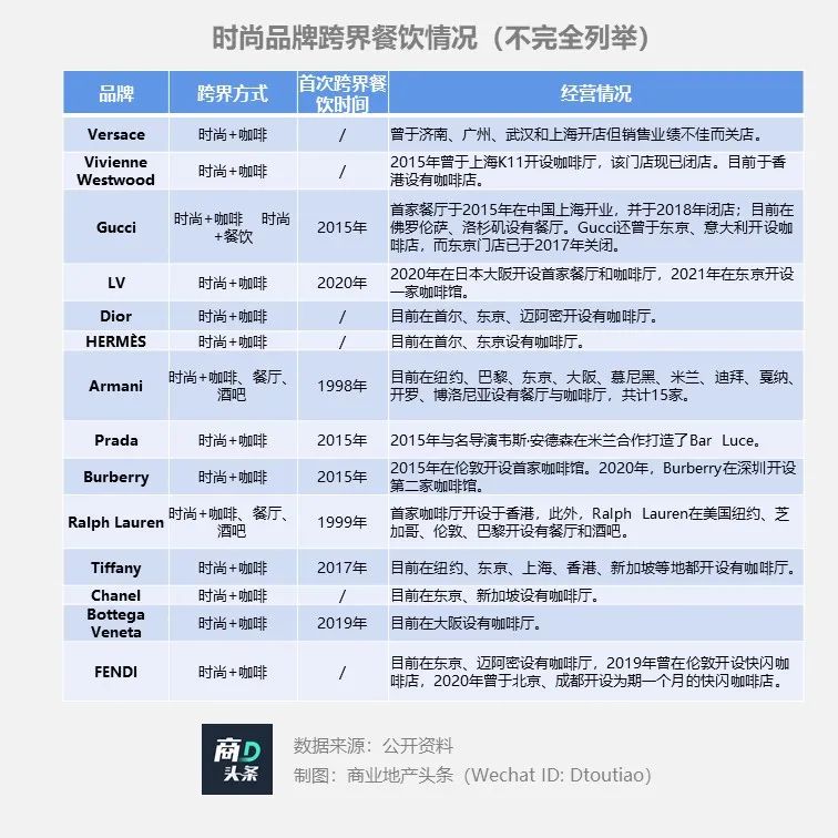 图片来源:阿玛尼官网Ralph Lauren则在纽约、芝加哥、伦敦、巴黎开设有餐厅和酒吧。2015年,其纽约门店Polo Bar引来歌手蕾哈娜和泰勒·斯威夫特等一众名人,开张两个月就在餐饮业竞争激烈的纽约一跃成为话题餐厅,至今热度不减。成功者不少,但无法忽视的是,在时尚奢侈行业,一如潘多拉咖啡折戟而归的失败案例亦不在少数。据商业地产头条了解,时尚奢侈品牌Versace、Vivienne Westwood、Gucci均有此失意经历。从2010年开始,Versace(范思哲)旗下副牌Versus陆续在上海、济南、广州和武汉开出咖啡店Versus Caffe,定价40-50元,略高于星巴克,店内均采用意大利家具及Versus品牌餐具,奢华毕现。遗憾的是,短短三年时间之内,Versus Caffe济南、广州、武汉的门店均因销售业绩不佳纷纷倒闭,仅余上海港汇恒隆广场的门店。及至后来,上海门店也难逃倒闭的命运。国内咖啡消费市场尚未成熟,是Versus Caffe在中国折戟的重要原因。2010年,咖啡行业的头号玩家星巴克刚在中国市场实现盈利不久,国民咖啡消费习惯尚未培养起来,奢侈品咖啡对于大部分人来说更是“一次性消费”,缺乏持久的热度。另一方面,当时国人对高奢品的消费也并表现出强烈的需求。对此,2013年,负责经营Versus Caffe的上海崇腾餐饮接受公开采访时表示,“关店与当地对咖啡的热衷程度以及商场的定位都有关,可能Versus Caffe还不适合当地的市场。并且由于范思哲的高端定位,使得咖啡店在中国的扩张速度也不会太快。”行至2015年,国内的咖啡市场、奢侈品市场渐趋成熟,Gucci、Vivienne Westwood均在上海开设餐饮店,但均落寞收场。据界面新闻,开业伊始,餐厅1921 Gucci需提前两周预约,无需预约的下午茶时段则需要排队1小时,但好景不长,三年后1921 Gucci闭店了。场景打造上,1921 Gucci与潘多拉咖啡一样,并没找到属于自己的“独特配方”——装修低调,以黑色和金色为主色调,木质、金属材质视觉冲击力弱,记忆点少。其次,餐厅与品牌的关联度弱,只有墙面和正餐餐布绣有“1921 Gucci”,难以满足顾客拍照打卡的欲望。场景平庸外,1921 Gucci闭店的2018年正是小红书引领的社交营销大风口,品牌经营判断失误,加之餐饮水平一般,Gucci错失风口,失利收场。站在国内奢品消费聚光灯下,回看时尚品牌跨界餐饮之成败,摸清故事背后之启示录,无疑显得更为实际、实在。毕竟,这股跨界浪潮还在继续。在全球市场上,咖啡、餐饮品牌众多,奢品餐饮的独特之处在于其生来自带的品牌基因。同时,随着instagram、twitter、小红书等社交软件在国内外的崛起,图片社交成为互联网时代的一大趋势。故高奢品牌跨界餐饮之时,需着重结合品牌原有的风格“打磨”门店的颜值,既满足消费者的拍照社交需求,又达成了品牌文化的向外输出。譬如,Tiffany的咖啡厅从墙面、沙发,到餐具以及服务员的服饰等等都沿用了品牌标志性的蓝色,顾客置身其中恍若身处一个梦幻的蓝色盒子。LV在日本的咖啡店内则有LV行李箱作为摆设,咖啡拉花上有着LV经典的印花,与品牌相关度颇高。