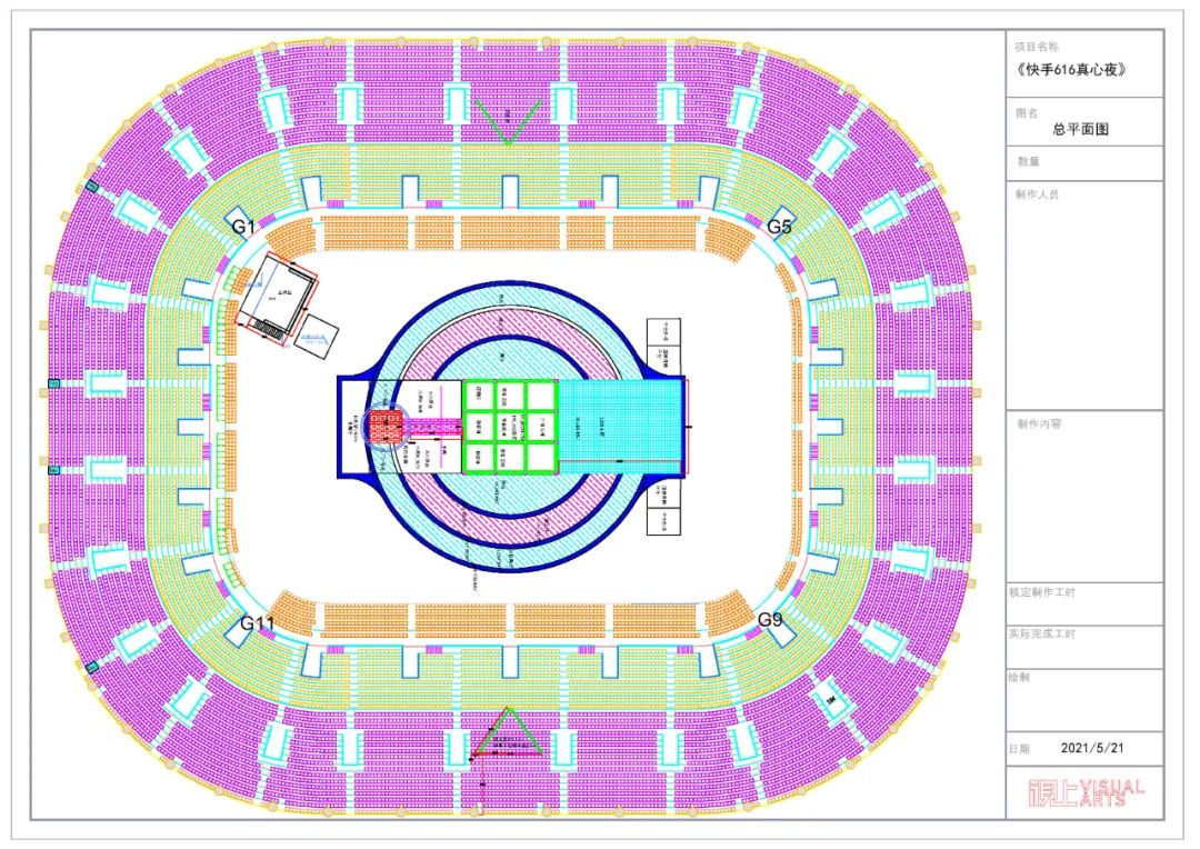 疫情防控原因,体育馆看台无法落座观众,对于一场在体育馆或体育场的直播晚会来说,看台观众的存在尤为重要,他们不仅仅是晚会气氛烘托重要载体,更是灯光借助对观众席观众的色彩处理、效果处理,与整个场内视觉进行衔接,达到与舞台表演浑然一体的视觉效果。把没有观众的观众席做出好看的效果为全景以及舞台的背景服务。