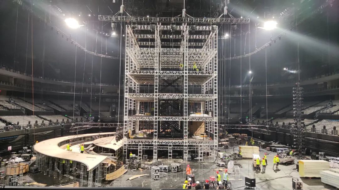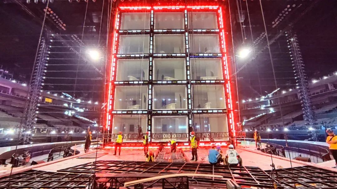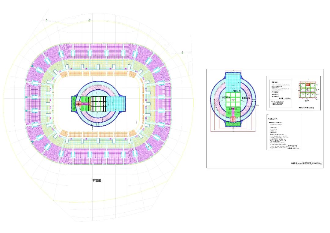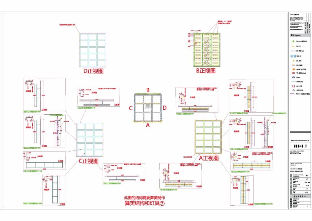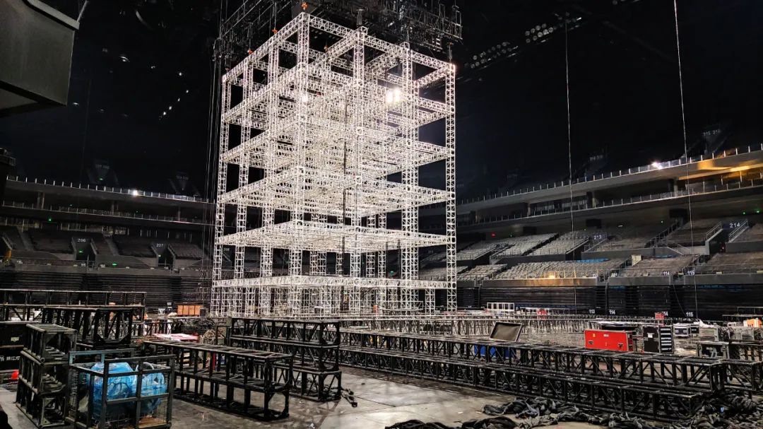 立面楼体是一个长14米、高18米的建筑,一面是15个3米*4米的直播间,另一面是矩形楼梯。整个建筑结构由1096米的520*520mm的truss组成,重达13吨,包含A、B、C、D四面灯具结构,以及数控、玻璃等总重达83吨。