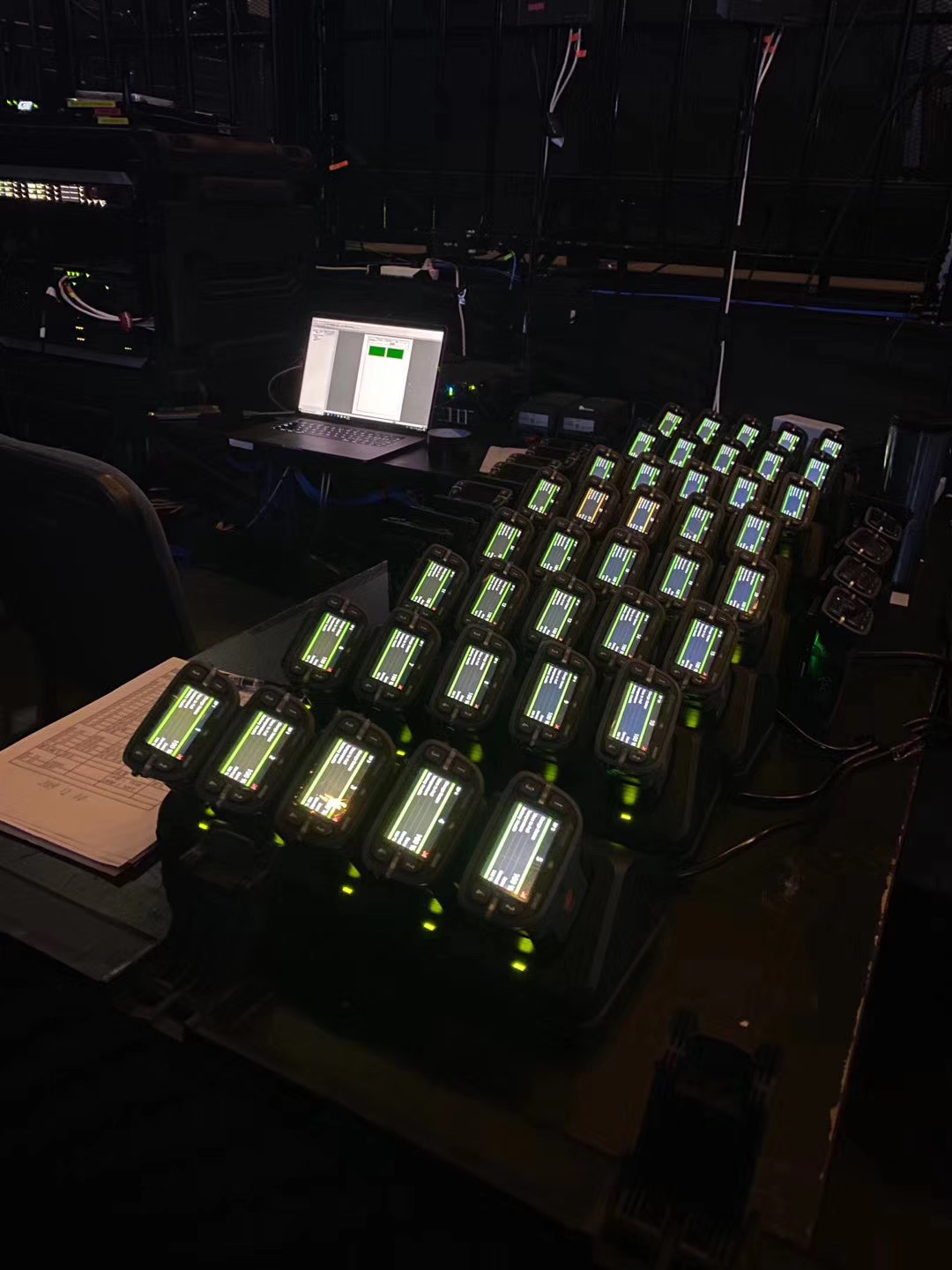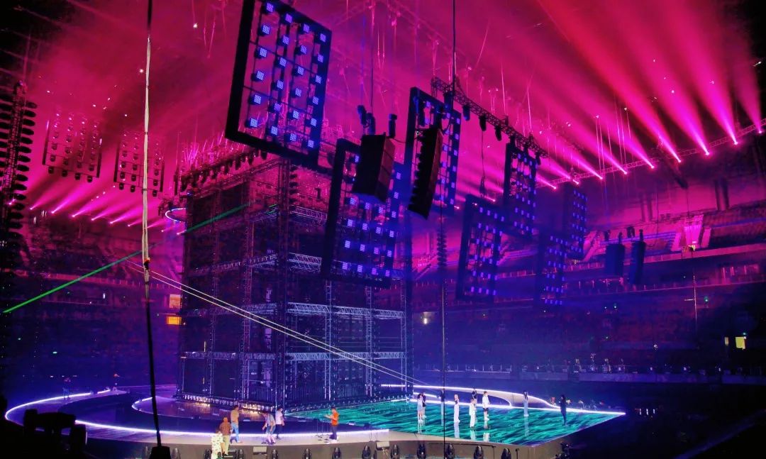 主扩系统由20只KSL8全频线阵列音箱组成,分别吊挂在主舞台左右两侧。超低频的音箱布局采用地面放置与吊挂组合的方式,其中主扩音箱的后方吊挂了2组超低频音箱SL-SUB,每组4只;同时在舞台前沿地面堆叠放置了16只超低频音箱SL-SUB。