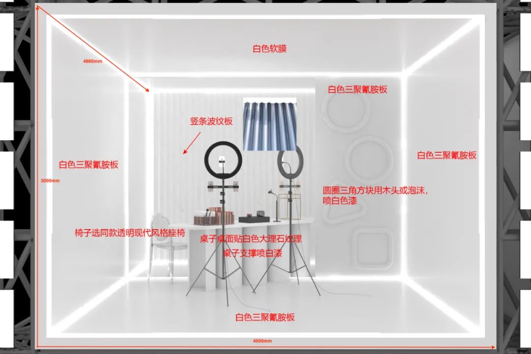 为了解决这个问题,最后将玻璃处理成通电玻璃,需要展示直播间里的内容玻璃为透光的,大部分表演环节都是半遮光的不透光状态。灯光用大量的灯具是直播间进行染色处理,丰富地屏舞台的背景效果。