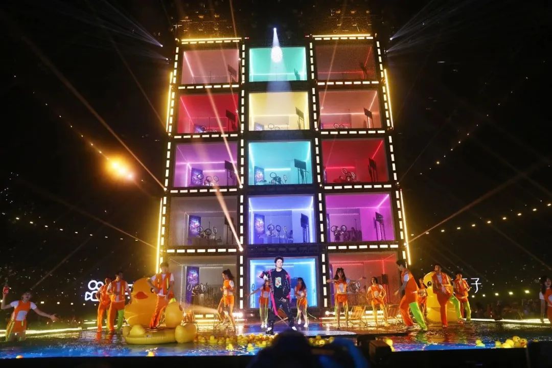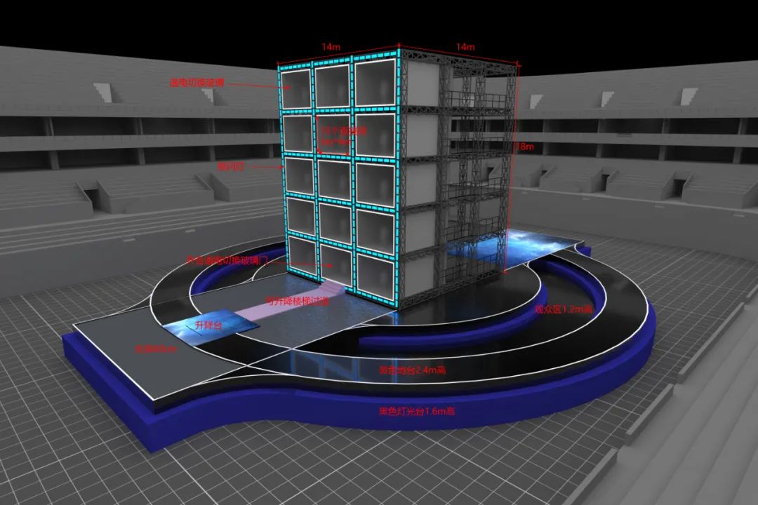 艺术总监唐焱为真心夜设计了以“摩天大楼”为主体结构,A舞台(水舞台)和B舞台(地屏舞台)交替变换的双舞台——整个舞台高达20. 5m。