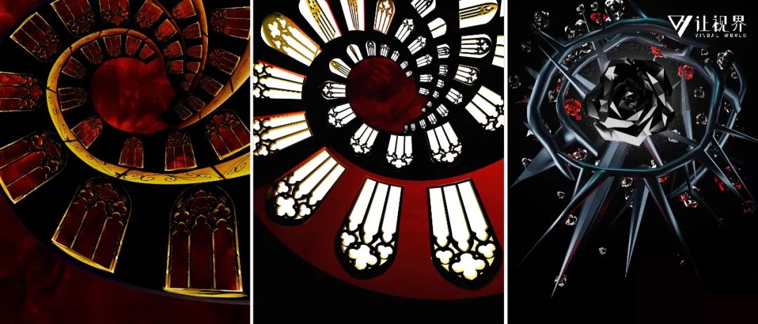 设计理念:整体风格偏酷、金属感。用一层层旋转纵深的楼梯空间配合歌词,运用光影变化,大色块的快闪、变换让整体的视觉空间更具张力,歌曲高潮部分加入了荆棘玫瑰的元素体现情歌的味道。