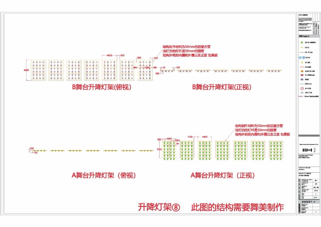 每个主舞台各拥有7组不用灯具组合而成的机械升降灯架,这样极大的提高了舞台的可变性。