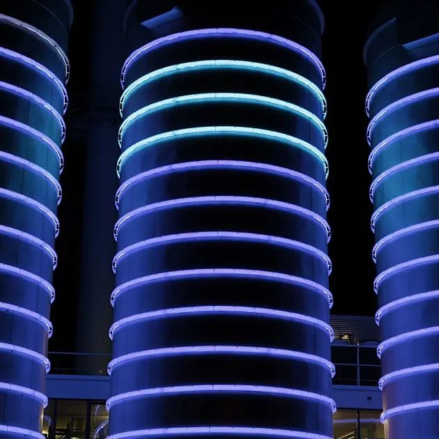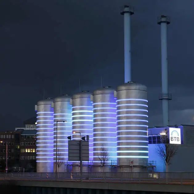 一个要点是展示现代发电厂的新型生态方式。水箱上的安装,使现代发电厂的高效生态维度和绿色革命具有一面。参观者以诗意的方式对抽象的技术过程有如诗如画的印象。每次通过安装的人,他们看到不同的画面,可以跟随坦克的工作。以看起来像旧霓虹灯的方式使用 LED 对于设计非常重要。每个环都可以通过 RGB-LED 显示所有颜色,环的控制与发电厂的控制相连。