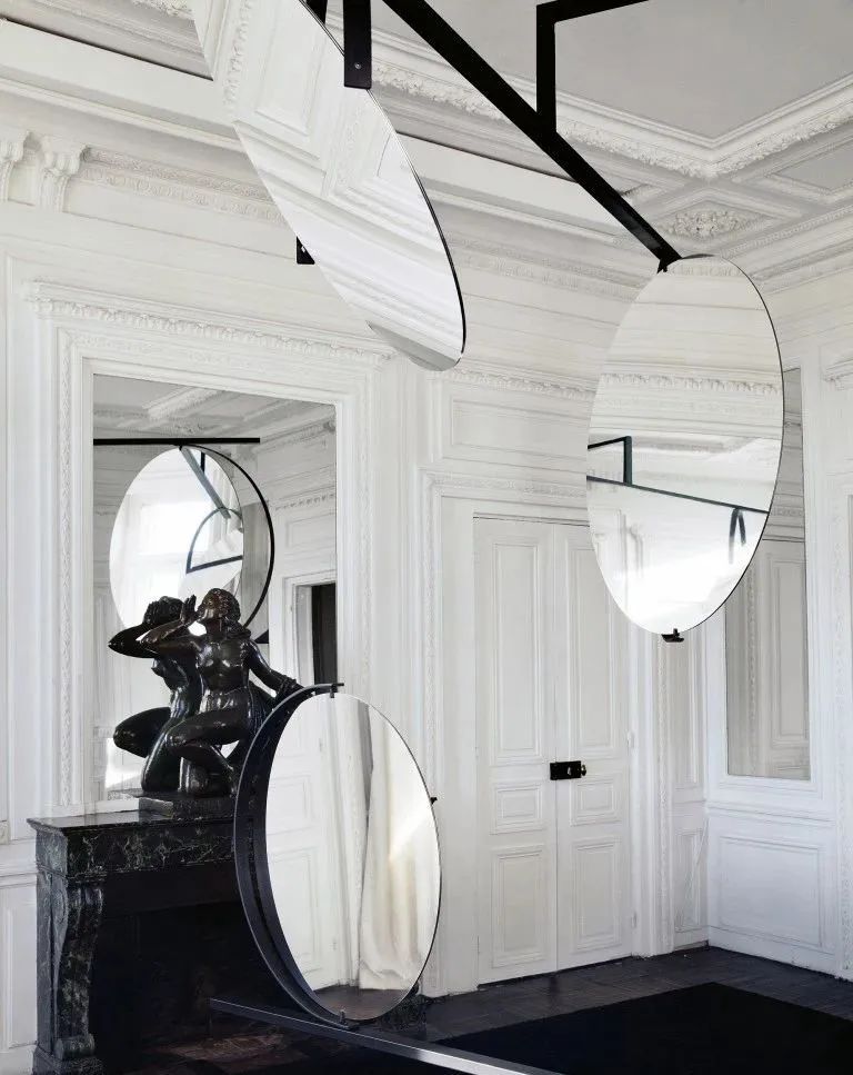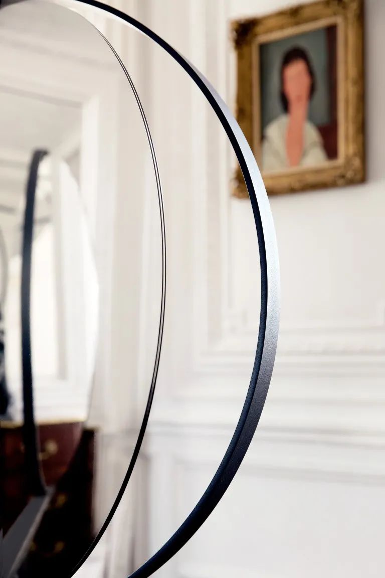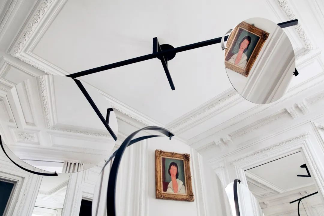 其中一个可动臂从公寓全白的天花板上悬挂下来,另一个则被放置在地上。圆形的镜子承受着张力,绕着它们共有的轴旋转。该结构所表现出的工业重要性和强烈的线条给人以野蛮主义的美感,与NapoléonIII风格的陈列室-迎宾公寓形成鲜明对比。