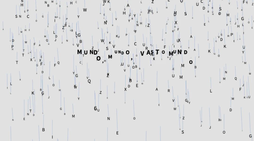 Gogoame是由Pedro Veneroso开发的网络艺术实验,由文本雨组成,该文本雨实现了物理引擎来模拟加速度,重力和风。Veneroso将物理力和环境因素与文本合成相关联,提出了线性文本的替代方法。在Gogoame中,字母和字符下雨,并且在雨中形成单词和短语。