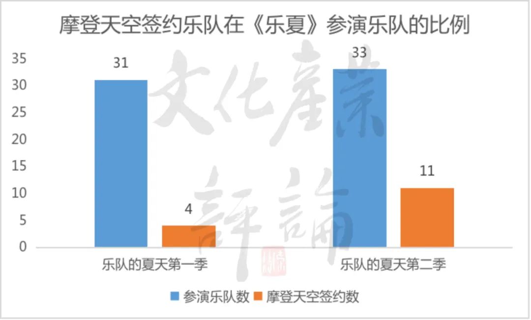 创新模式之综艺+衍生产业以乐队、说唱、脱口秀、国风国潮为主题的新兴综艺是近年来综艺内容阵地中的“新物种”。这类综艺呈现小众化特性,是消费者了解流行文化的前沿阵地,也是文化与商业结合的衔接触点。相关小众综艺的火热,不仅带动起一股亚文化风潮,让underground文化走向大众,更促进了潮牌服饰、独立音乐厂牌、线下演出等周边细分市场的快速崛起。可以说,细分领域的蓬勃发展,离不开以综艺节目为先导入口的推动,从主流到非主流,引小众至商业化,这是一个互相促进的闭环。2019年和2020年夏天,爱奇艺和米未推出的独立乐团原创音乐综艺《乐队的夏天》强势出圈,捧红了新裤子、五条人、重塑雕像的权利等宝藏乐队。而他们背后的经纪公司摩登天空或成最大赢家。据文化产业评论(ID:whcypl)统计,《乐队的夏天》中出场的64家乐队中有15家的经纪合约属于摩登天空,占比达23%。