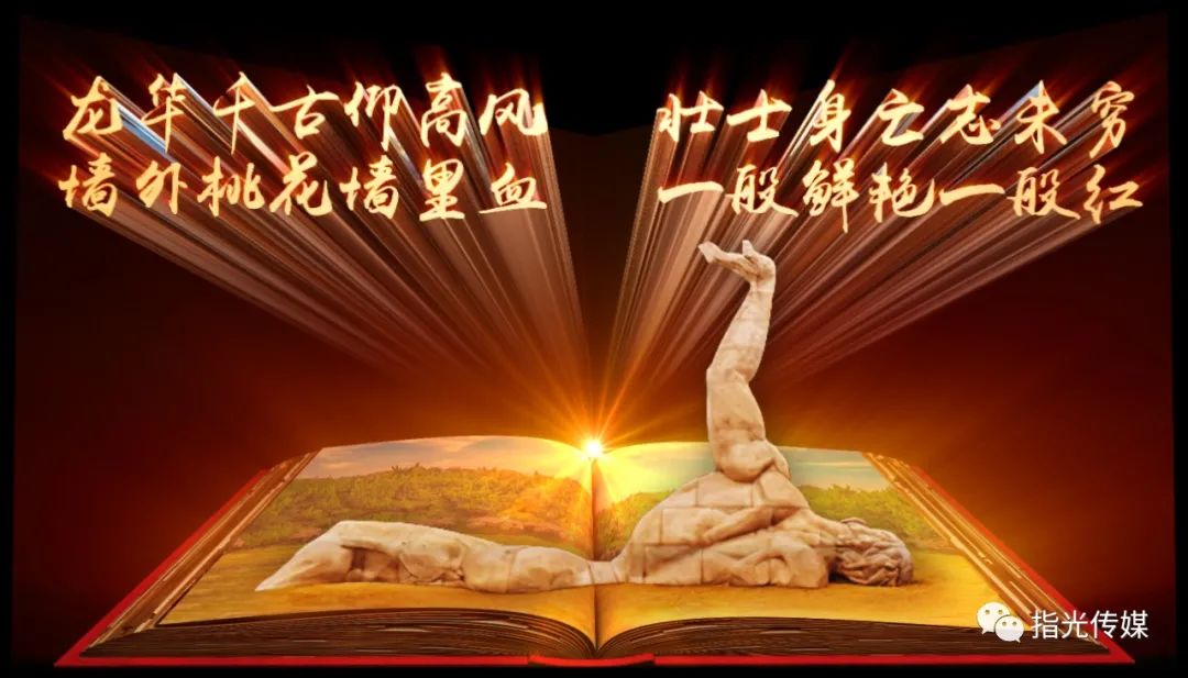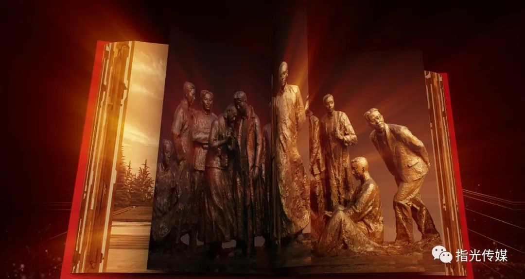 向先烈致敬,舞美移动屏变换夹角状态,画面从龙华烈士陵园20多位烈士及箴言始发结合特有雕塑设计。为呈现3D效果,将移动屏夹角的效果和载有历史的书籍结合,展现历史革命先烈的厚重感。