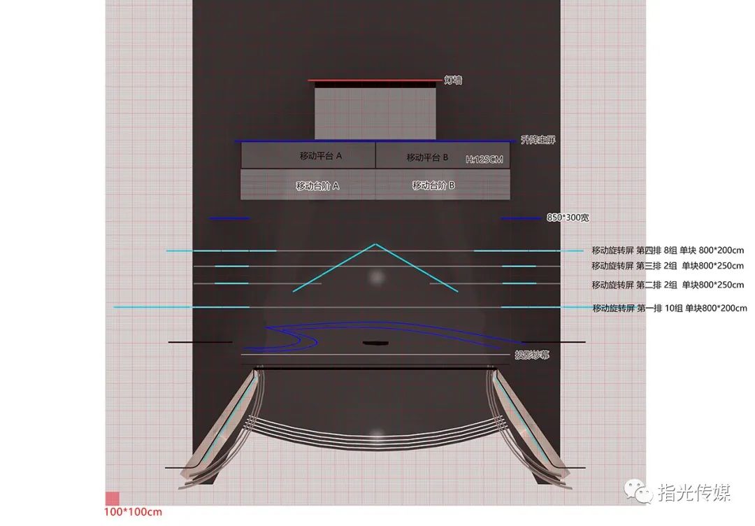 百年内场灯光整体创作及舞美方案,首先以电视播出为主,在选用灯具方面就要考虑功能性强、稳定、照度统一、显值高等优先条件。其次就是要根据舞美设计方案来做灯光方案,此次对于灯光来说也是一次挑战,因剧院前区及台口和两侧空间有限,关于前主要表演区舞美方案部分有:有台口纱幕、台口檐屏幕、台口两侧屏幕及移动旋转屏幕等占用多大部分空间,这样对于灯光来说可利用空间极少,经过多次和舞美设计、场地方沟通做出以下方案:首先完全舍弃剧院原有的吊杆条件,在表演区顶光选用吊Truss桁架结构,这样可以节省空间,每道桁架可多选用灯型、数量安装灯具。和移动旋转屏方来回沟通核实空间距离,在四道移动轨前后、中间各留出80公分的距离来安装几道顶光桁架和侧光吊笼灯具,其次就是后区顶部根据演区纵深均布安装桁架结构,耳光位置被台口两侧屏幕完全占用,择选用观众席三层前沿、两侧包厢位置安装灯具,主面光位置择选用二道面光、追光室及二楼观众席中间位置搭建结构架安装。为保证电视播出画面光比协调、人物立体感强、色彩饱和度高,此次晚会在剧场内共使用摇头电脑灯具六百余台。