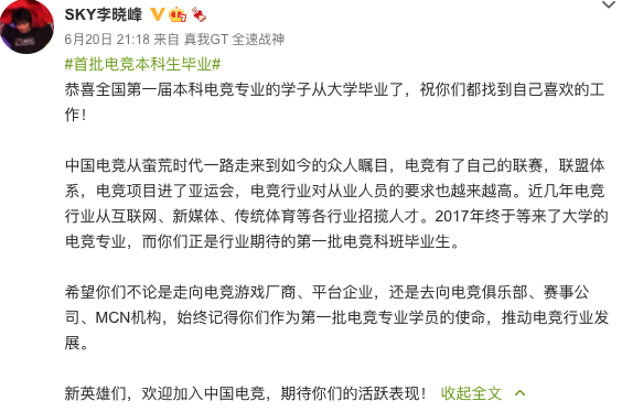从蛮荒时代到日渐正规的中国电竞产业,迎来了历史上首批经过高校培训的毕业生。为此,素有“人皇”之名的中国传奇电竞选手Sky李晓峰,在微博上为首批电竞专业的毕业生献上了毕业寄语。