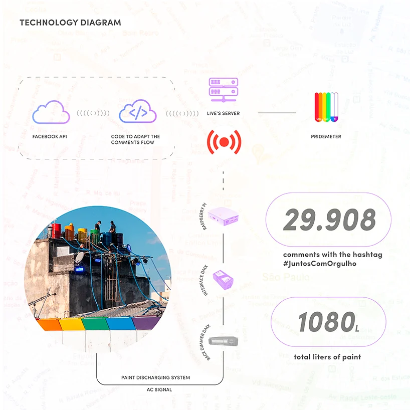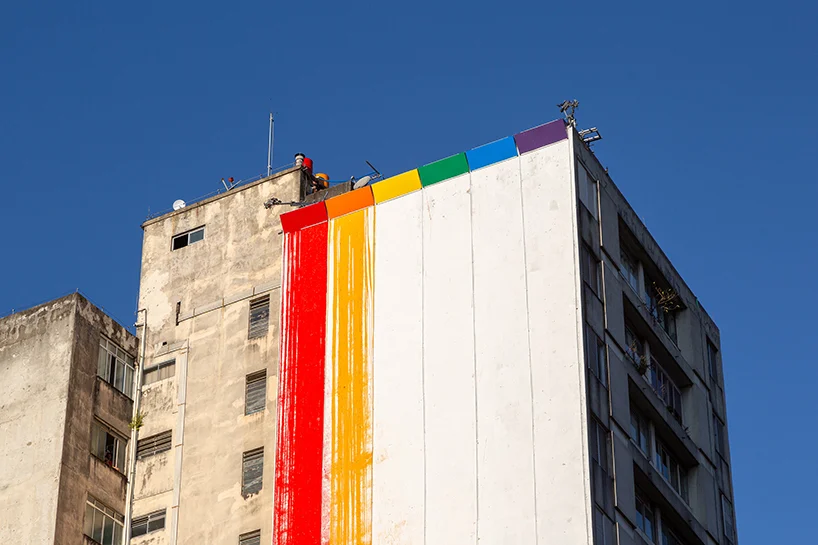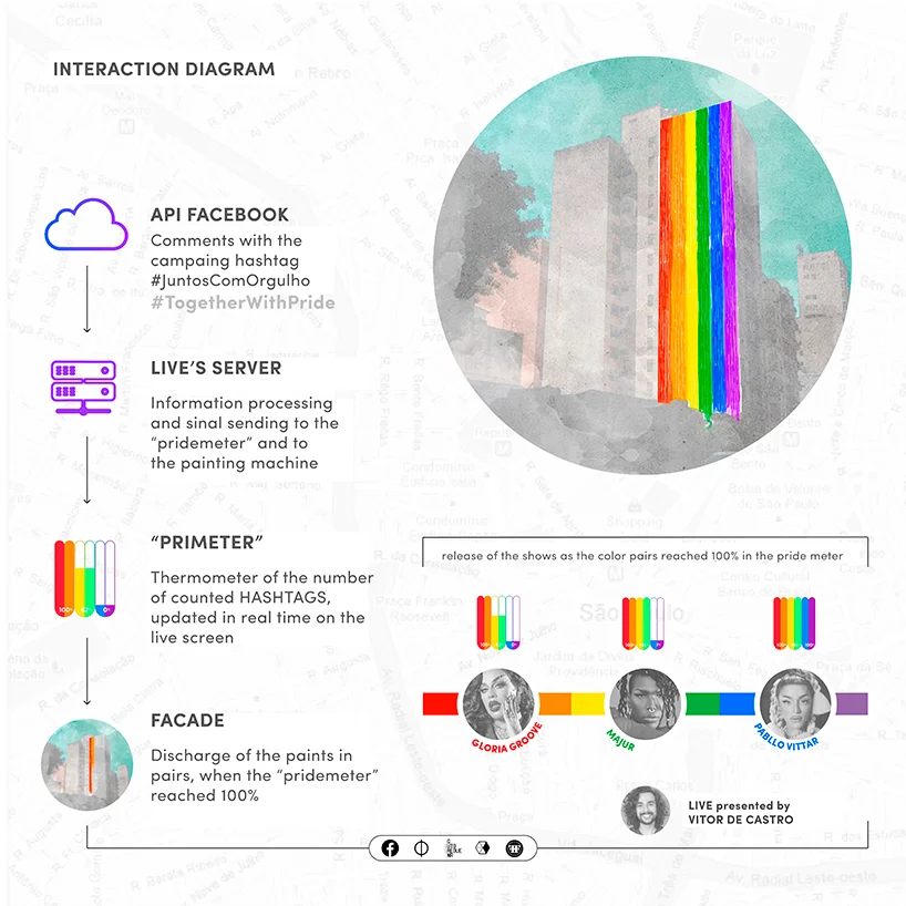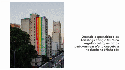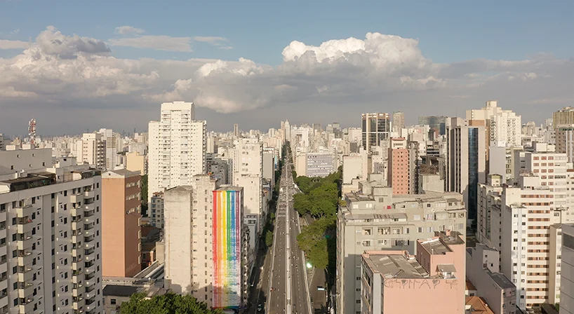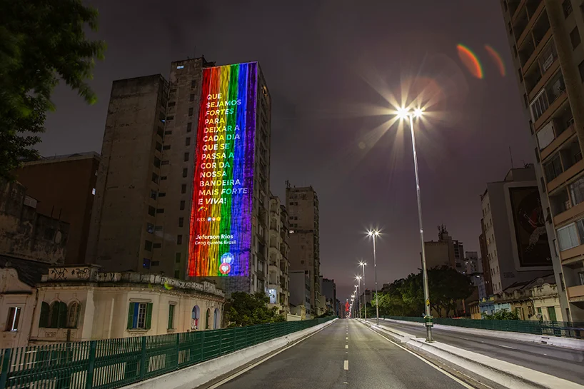 装置被安装在圣保罗市最具标志性的街道minhocão,足足40米长的面板上绘有标志性的彩虹旗,并在夜间进行映射投影。