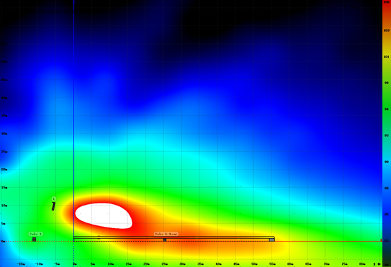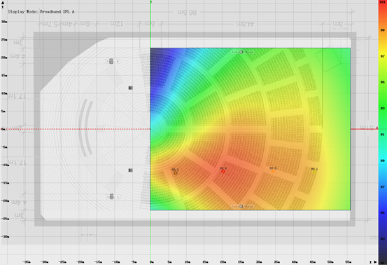 通过Resolution软件,我们搭建了场地建模,模拟出声场预测结果。可以看出,观众坐席的大部分位置,都能得到较为均匀一致的声压级,后区的覆盖也得到有效的控制。