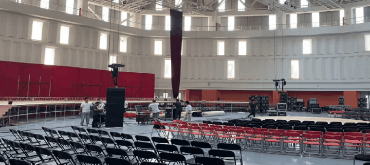 毕业典礼是在大学的篮球场中举办,从舞美设计中可以看到,面向观众席的是弯曲的主席台,此外还设置了一个圆形主讲台,置于4000多位毕业生坐席的前端,被观众席以半包围的方式环绕着。而整个观众席需要实现的覆盖面积是非常大的,同时还需要尽可能的避开中间圆形的主讲台。然而,在场地的最后端,观众席的正后方,有一个巨型的LED大屏。这就意味着,声场的覆盖要尽可能躲避大屏,防止发生不必要的声反射。因此,主扩系统的吊装位置以及阵列的张角姿态需要慎重决定。