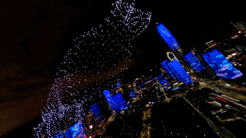 深圳CBD上空用无人机组成的拓荒牛和标语。