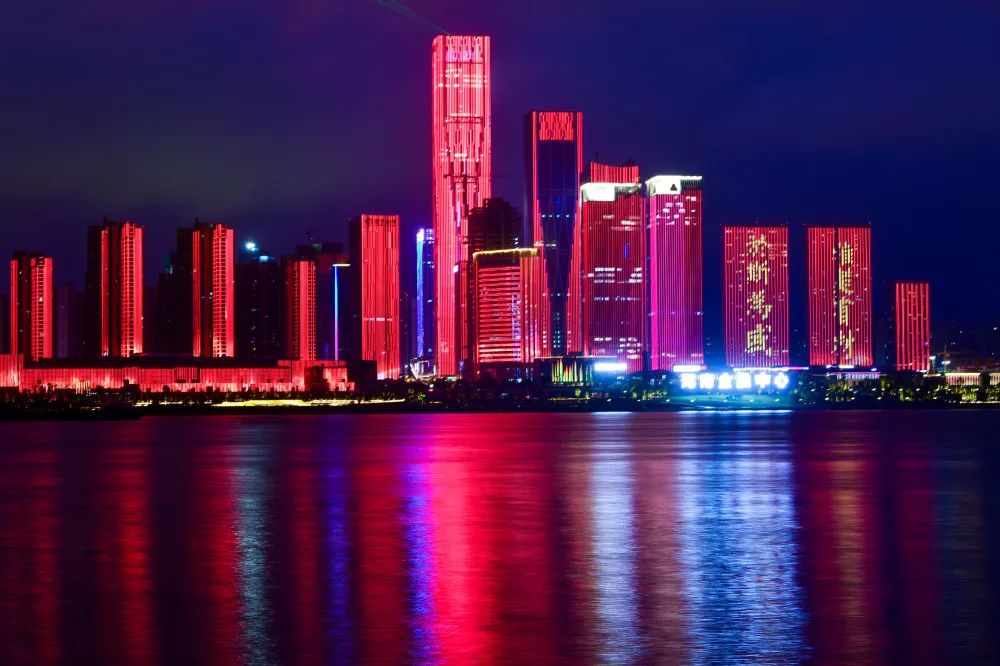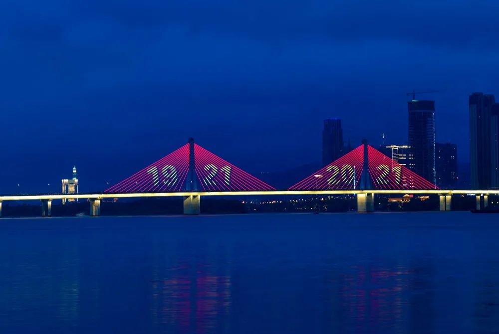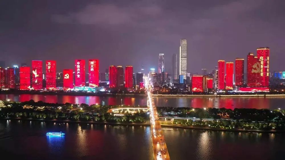 6月30日晚7点半,长沙万达广场、三馆一厅、银盆岭大桥多个地标被红色灯光点亮。联动灯光表演分别以“百年风华 红色长沙”和“沁园春·长沙”为主题,展现长沙独有的红色底蕴和文化魅力。20公里的湘江水岸线,用灯光的语言,描述着中国共产党百年历史长卷。“热烈庆祝中国共产党成立100周年”“伟大的中国共产党万岁”等字样滚动播出,惊艳长沙。