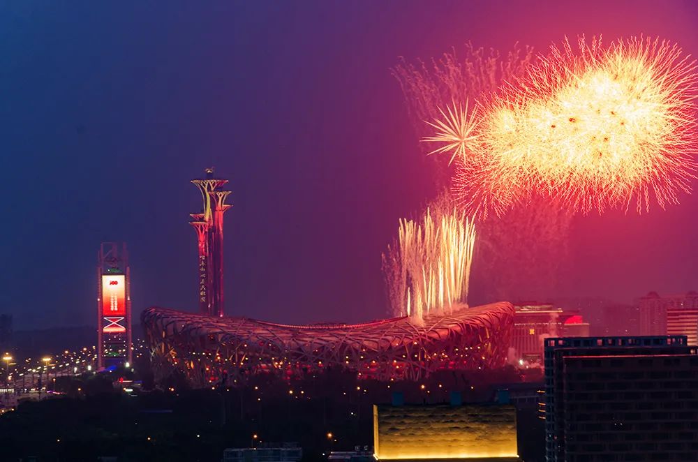 6月28日晚,北京,焰火盛放在国家体育场上空。当日,庆祝中国共产党成立100周年文艺演出《伟大征程》在国家体育场盛大举行。