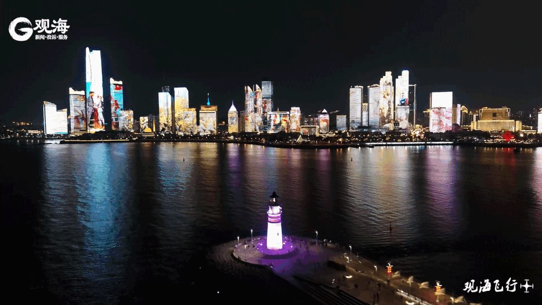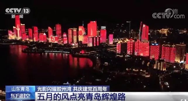 为庆祝中国共产党成立100周年,青岛浮山湾畔沿海一线楼宇已换装建党100周年主题灯光秀灯光秀,以浮山湾海面、沿海一线的建筑楼宇、夜空等为画卷,以炫目的景观灯光等为画笔
