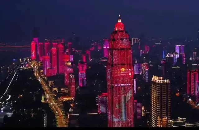 夜色中,长江两岸错落有致的高楼统一披上了“中国红”,远处的晴川桥,好似江面上拂动的琴弦,正弹奏着盛世华美的乐章,而桥对岸蛇山之巅的黄鹤楼,翘角飞举披盛装,欣赏着新时代的国富民强。
