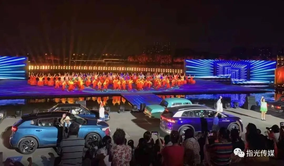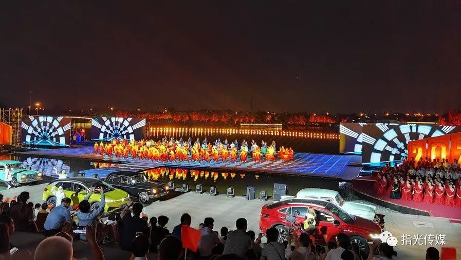 时代秀《嘉速度》,动感的鼓点气势磅礴,响彻云霄。10辆汽车搭载着工人、农民、环卫工人、志愿者等驶进舞台,展现改革开放后,嘉定各行各业蓬勃发展,乘风破浪、百舸争流……