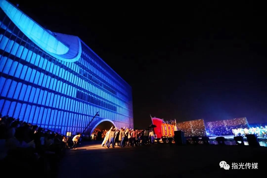 光影秀《星火》:嘉定早期一批走上革命道路的有为青年在《共产国际歌》的音乐中走向舞台,手中高擎火把,点点星火汇聚成一枚熠熠闪光的党徽,理想之光如同永不熄灭的星辰照亮天际。