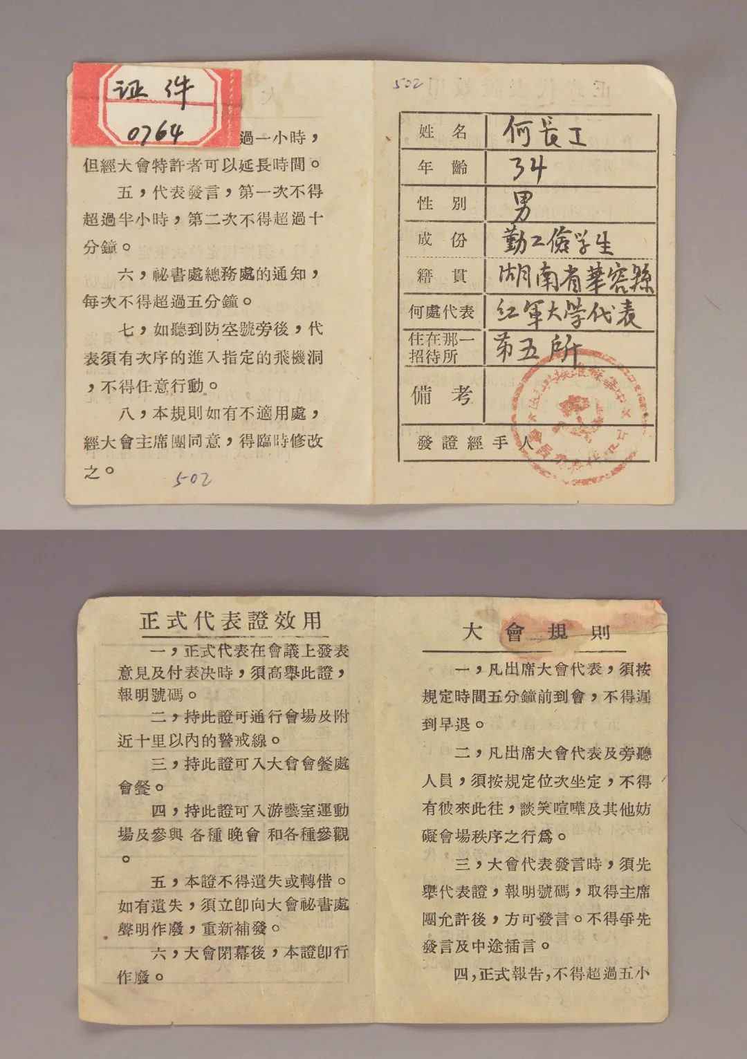 在瑞金中央革命根据地历史博物馆收藏的11118件文物中,有一张简易而神圣的第二次全国苏维埃代表大会代表证。这张淡黄色纸质证件,是1934年1月何长工出席第二次全国苏维埃代表大会时的正式代表证。该证系六十四开双面印刷的折叠式证件,有四面,第一面各栏目中填写了何长工的姓名、年龄(34岁)、性别(男)、成份(勤工俭学生)、籍贯(湖南省华容县)、何处代表(红军大学代表)等,在“发证经手人”栏中,盖有“中华苏维埃共和国中央代表委员会”印章;第二面印有六项“正式代表效用”的条文;第三、四面印有八条“大会规则”。如,正式代表在会上发表意见及付表决议时,需高举此证,报明号码,并取得主席团允许后,方可发言;对发言的时间也进行了明确,规定第一次举手发言不得超过半小时,第二次不得超过十分钟。这张历经峥嵘岁月的证件,见证了当年轰轰烈烈的苏维埃民主选举运动,见证了苏维埃工农兵代表参政议政的历史时刻,见证了人民代表大会制度初始发祥的伟大实践。