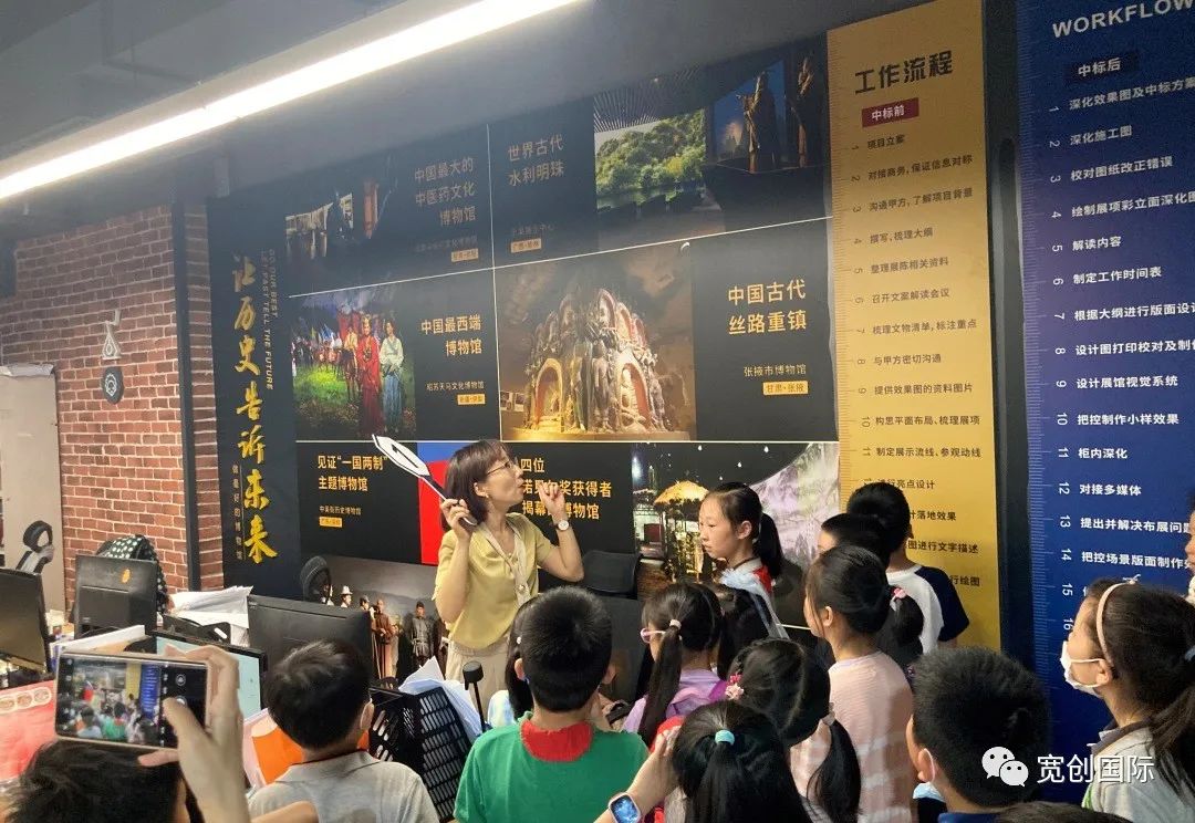 在科普讲座上,我们通过问答的形式与同学们进行互动,介绍了宽创国际设计的许多场馆,让同学们更加深入了解策划设计博物馆后面的故事。参观过程中他们看到了设计师大哥哥大姐姐们的工作场景,纷纷赞叹。通过历史、自然、科普等不同主题的博物馆的展示与专业的讲解,学生们对场馆设计和运作有了进一步的了解。