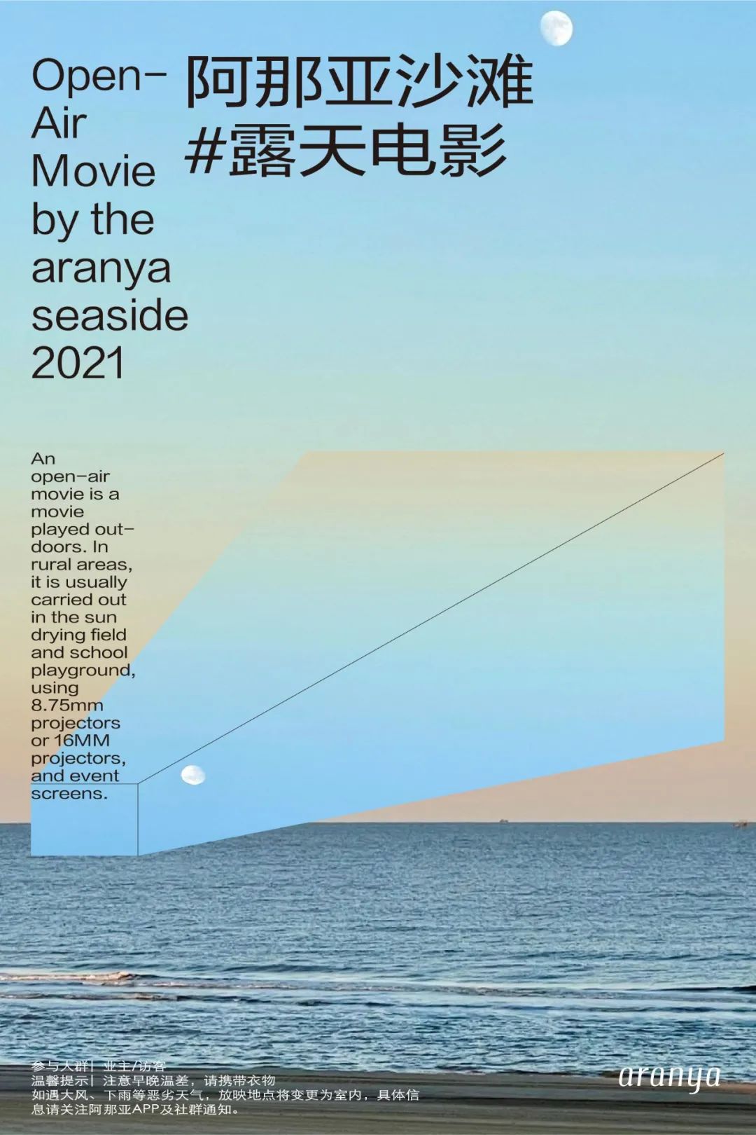 温馨提示:如遇大风、下雨等恶劣天气,放映地点将变更为室内,具体信息请关注阿那亚APP及社群通知。