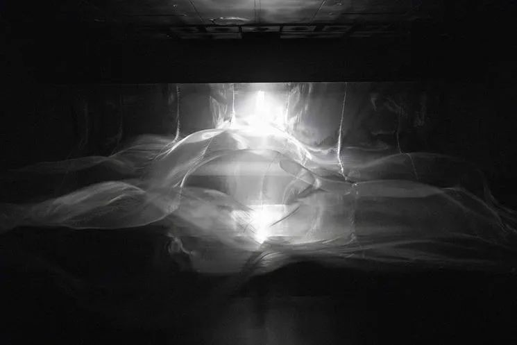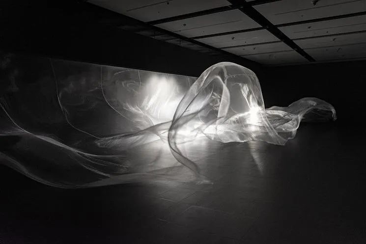 被气流吹动的白纱在半空中舞动,薄纱如云朵轻柔,亦如浪花般反转卷起层层波澜,在灯光的照射下,呈现出水流动和蒸发的视觉效果。机械与自然之力的相互作用带动绢布无规律的在空中画出不可预测的移动轨迹及失重感,空间的界限在物体不断流转的变化中改变,人们对时间的感知也随着织物起伏变缓。