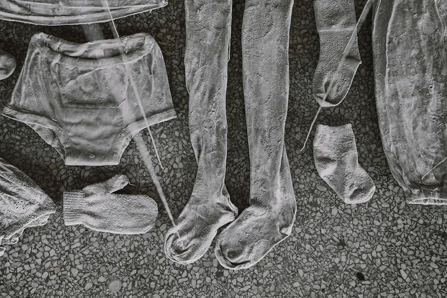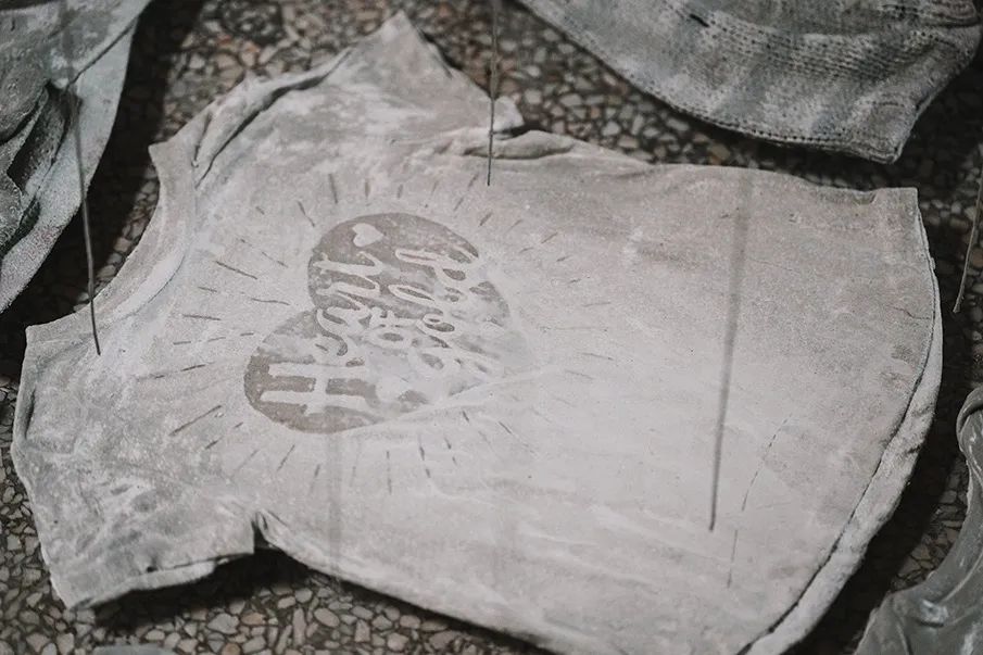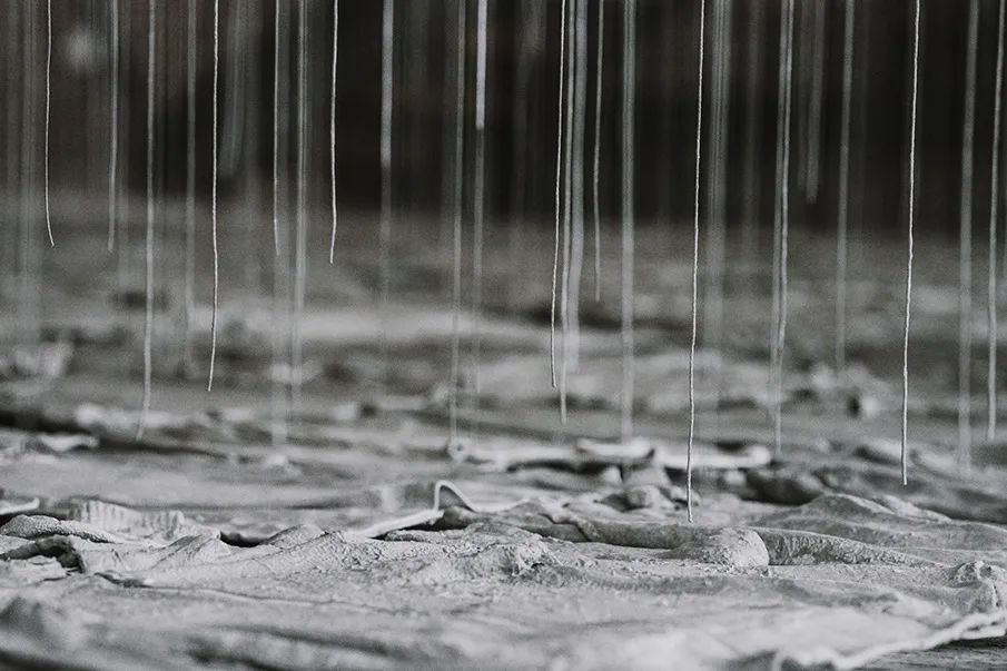 每一个由数百件旧童装组成,这些衣物已被工业水泥保存和安静下来。这些硬化形式的小衣服离地面只有几英寸,在画廊的地板上形成了广阔的空间。在灰色的衣服上方,天花板上悬挂着数千条浸有水泥的白色棉线,停在衣服上方几英寸处。尽管这些服装已经被水泥改造过,但它们仍然保持着褶皱、文字或一丝色彩的垂坠感、褶皱和温柔的细节,这些精心雕刻的服装形式体现了被拘留的流动儿童的缺席。