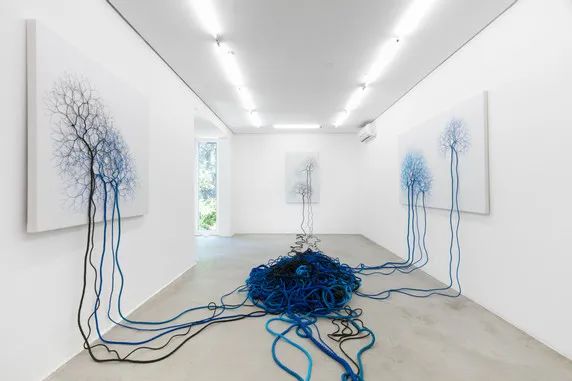 巨大的树状装置,扇形穿过画廊的地板和墙壁,形成精致的绳索花朵。另一个是小一点的作品,是艺术家对COVID-19的反应。艺术家结合了数学、建筑学、物理学原理,以单一的绳索作为自己的创作材料,绳子缠绕交错,使其形成了一张有系统的网络,以此来表达现代人之间错综复杂、剪不断理还乱的关系。