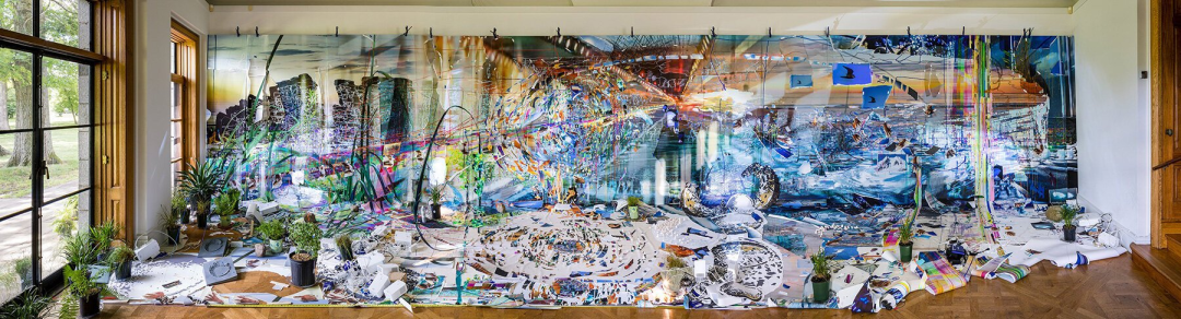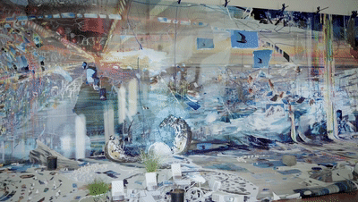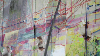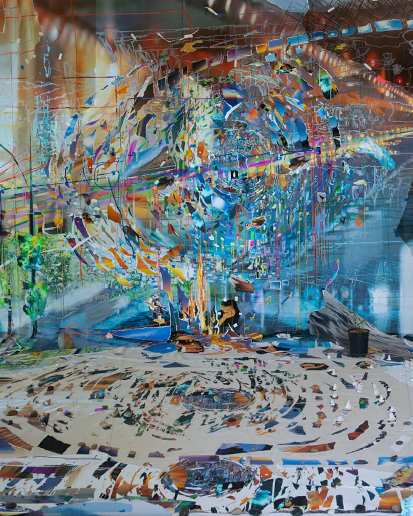 通过对景观本身的物理解释,艺术家将《Fallen Sky》制作过程中的材料和碎片融入到《Fifth Season》,将创作过程本身展示为一个发展和消亡的系统。Sarah Sze 安装了一系列大型墙板,长达50英尺,这些墙板经过涂漆、印刷和拼贴,营造出一种进入深空的衰退感。Sarah Sze 利用延时相机研究画廊空间的光线,并将录音投影到捕捉光线的画布上,参观者可以在透过窗户的自然光线下一起体验。自然光、视频、图像和绘画之间的相互作用反映了我们感知和解读自然的方式。电缆线、绳子、棉花棒、粘土、被剪碎的照片,日常材料经由她拼贴组装化身带有未来气息的当代艺术,让参观者于其中体验到数字图像时代流动的海量信息。