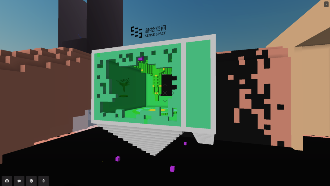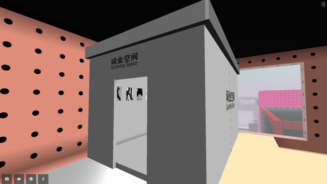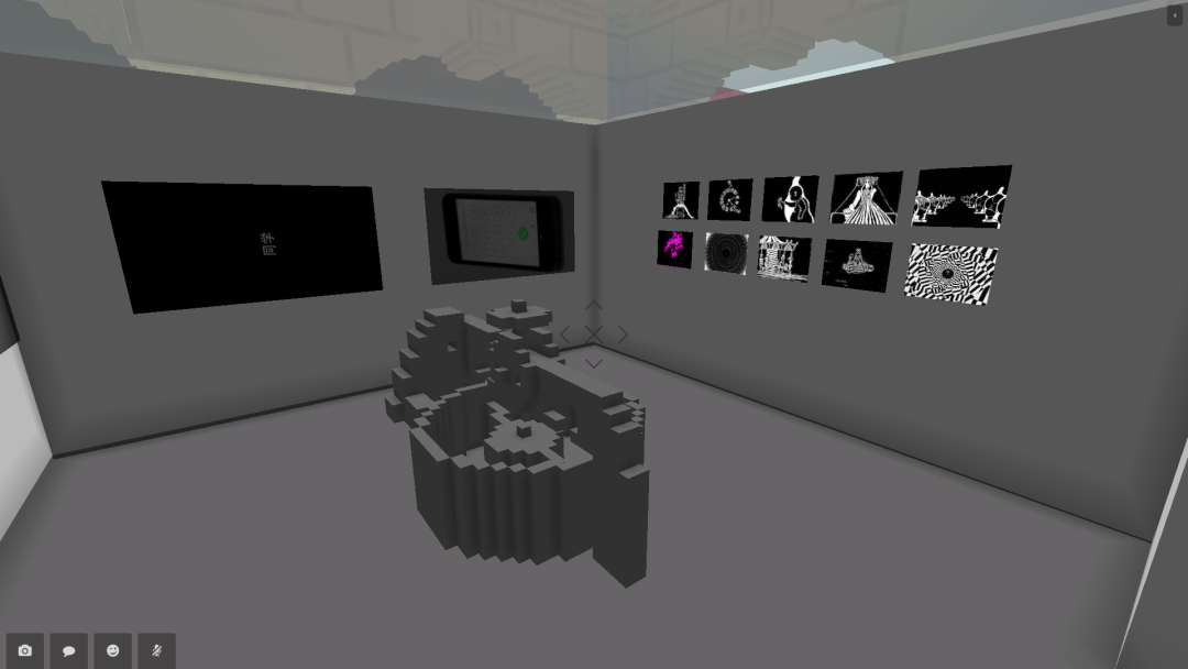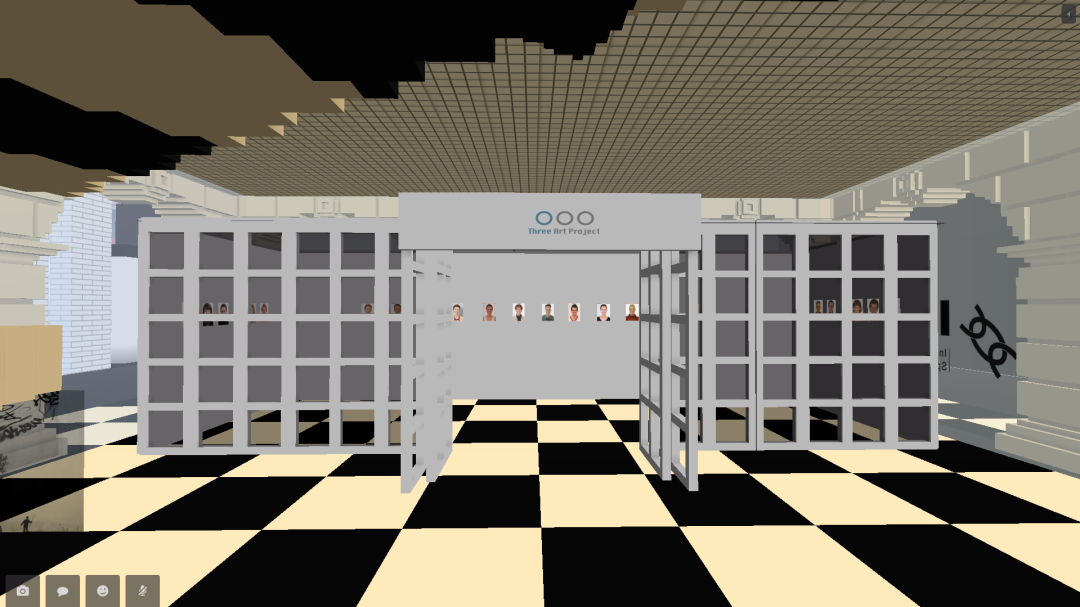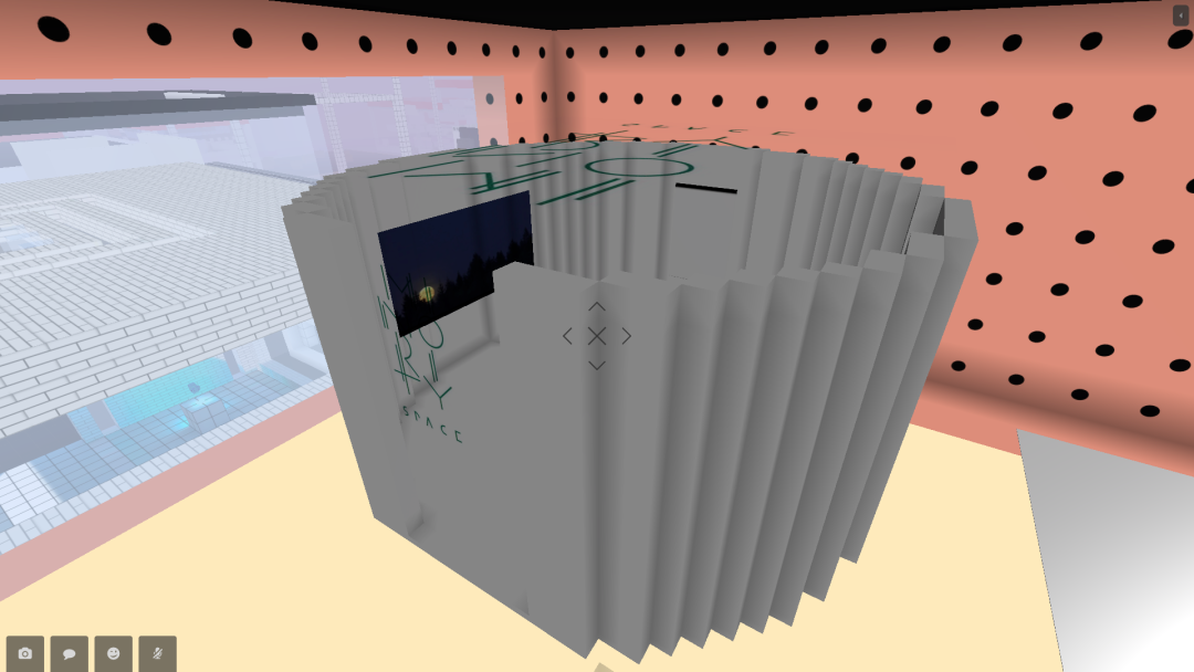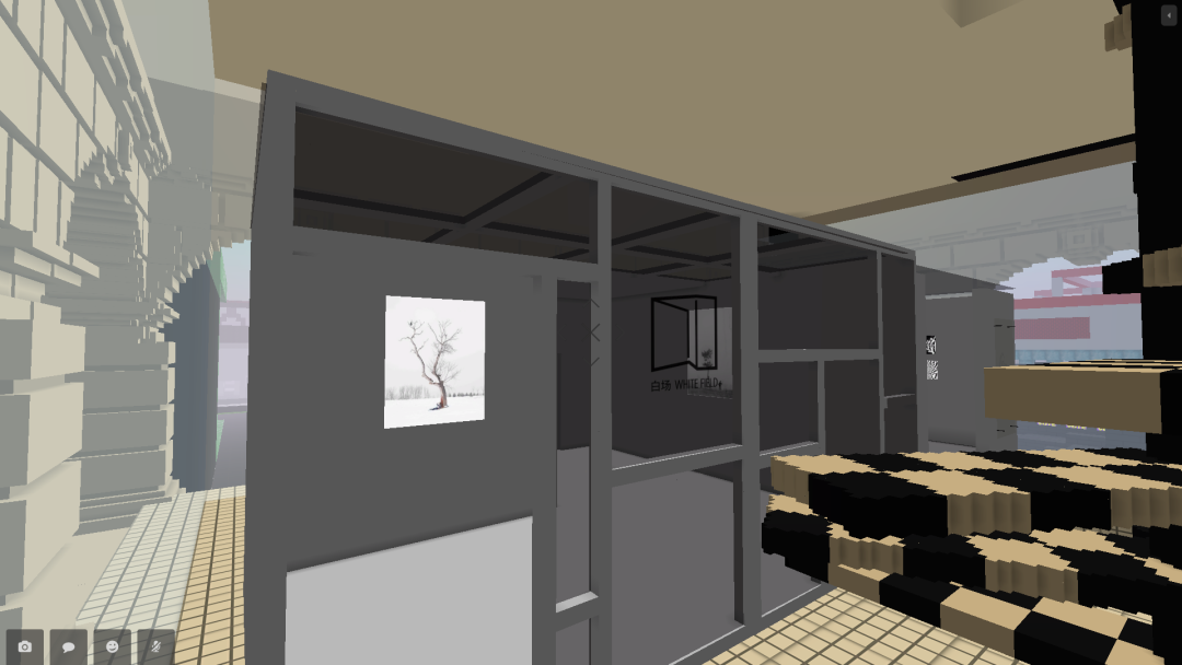 蔡锦空间在CryptoVoxels的展馆中用体素(voxels)搭建了798厂房中的大机器,望远镜空间做了一个跟草场地实体空间一样的门头房,词业空间搭建了一个集装箱式的展厅,三个艺术计划用一个空白墙面展示了影像作品。大多数项目移植了实体空间的经验,以最具代表性的元素在虚拟世界中标记身份。
