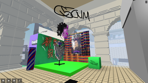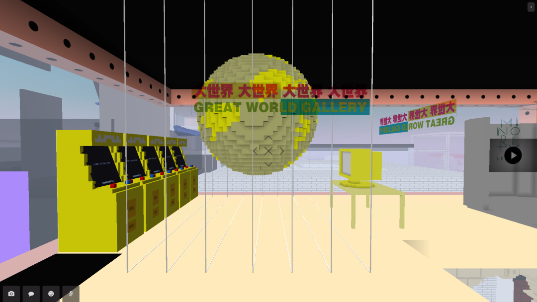 叁拾空间展出的梁宏伟和刘符洁以CryptoVoxels的视觉语言重新制作了数字作品,在极具仪式感的绿色空间中营造了一个未来感的神圣氛围。C5CNM的“杀马特发廊”,叶甫纳和罗福兴反复尝试用小方块塑造一个假发,但技术的限定很难满足头发的飘逸感,最终,这个假发以极其坚实的视觉呈现。大世界画廊延续了之前的“虚拟”项目,艺术家用假名(或者艺名)代替自己的真实身份,并以虚拟人设进行创作。香川奇尻和某延两位艺术家搭建了大金球和游戏机,形式背后,他们的作品通过互联网的分发探讨社交媒体情境中的人际关系。但因为技术的原因,最终没能实现交互的体验。
