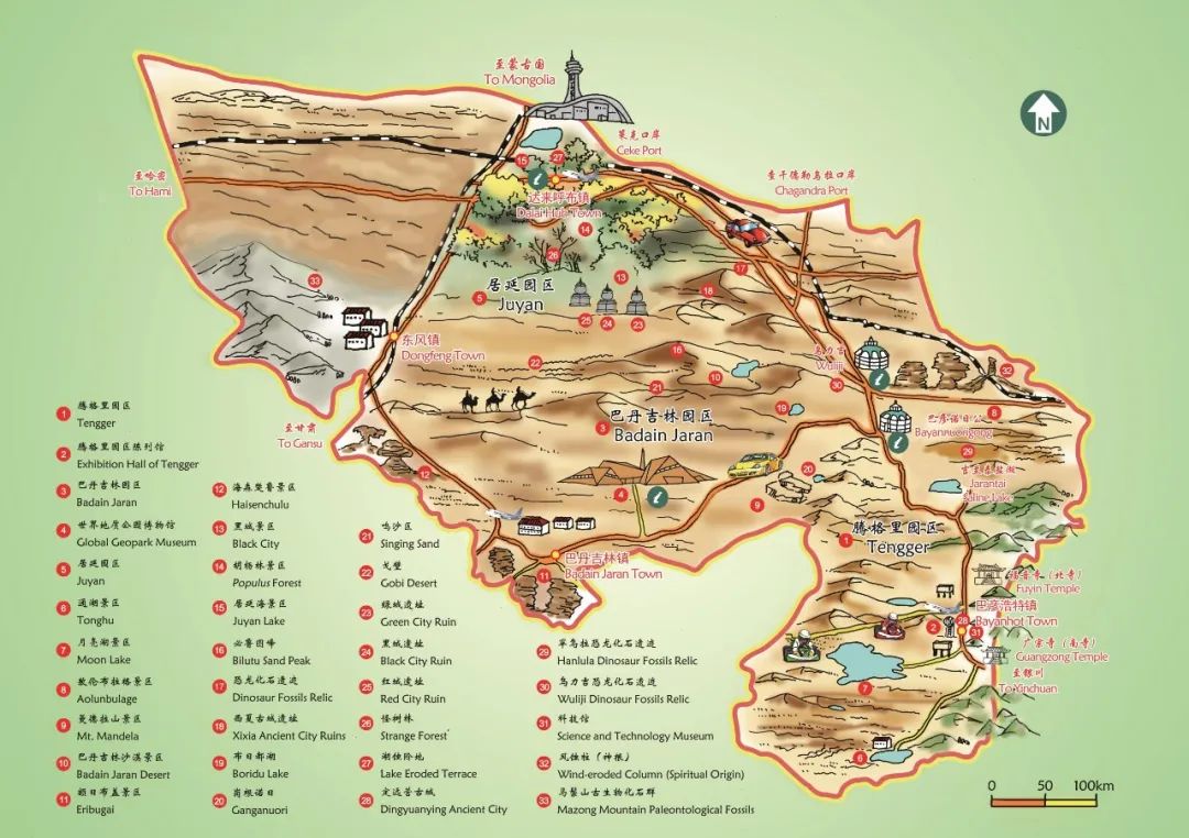 阿拉善沙漠世界地质公园位于位于内蒙古自治区最西部的阿拉善盟境内,因其特殊的地理位置、地质构造、生态环境和气候条件形成了以巴丹吉林沙漠、腾格里沙漠、额济纳胡杨林和敖伦布拉格峡谷等为主体的地质景观。