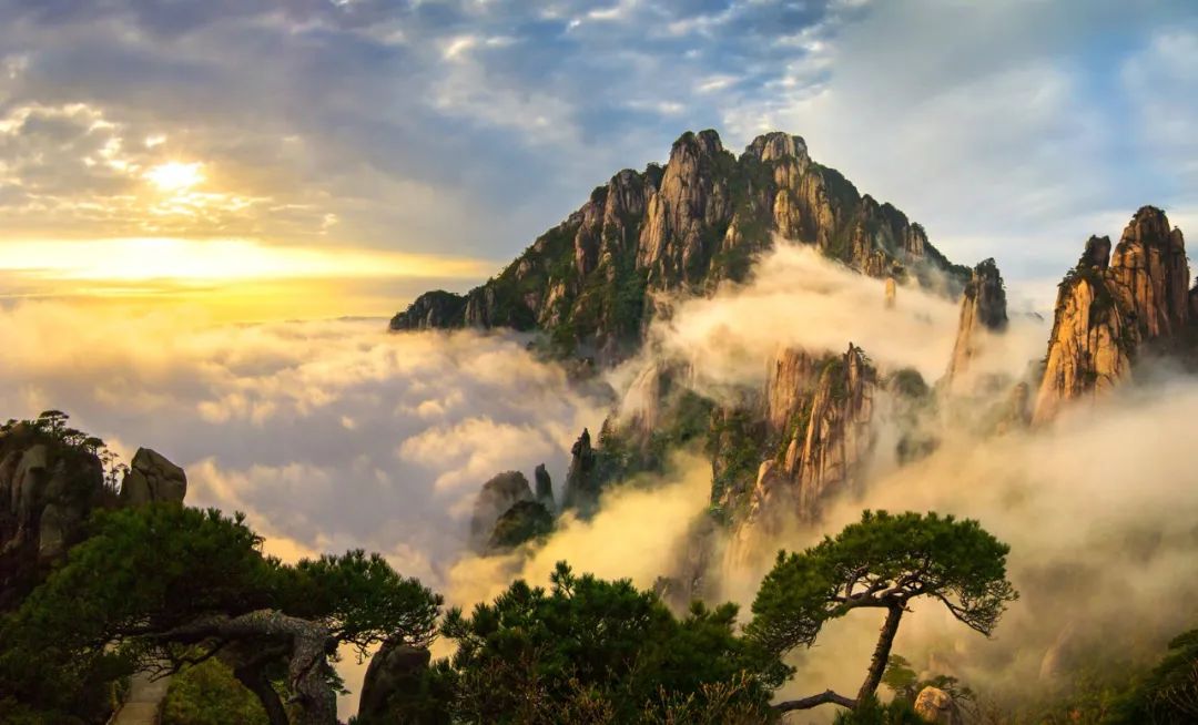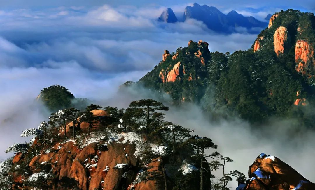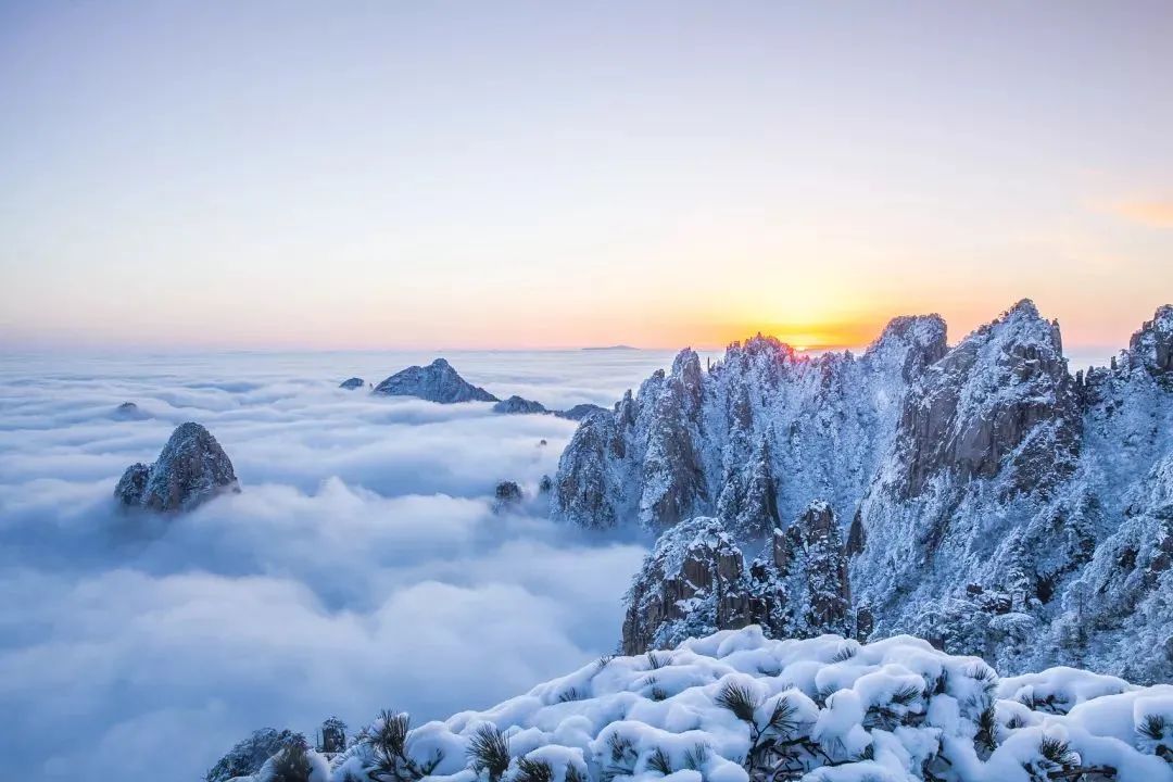 黄山世界地质公园位于安徽省黄山市,集高峰森林地貌为一体,公园拥有典型的花岗岩景观以及岩洞、泉水、池塘、小溪、瀑布等其他景观。冬季的黄山是一年之中颜值巅峰,奇松、怪石、云海、温泉、冬雪得以在此时完美的呈现,宛如一幅绝色的中国山水画。