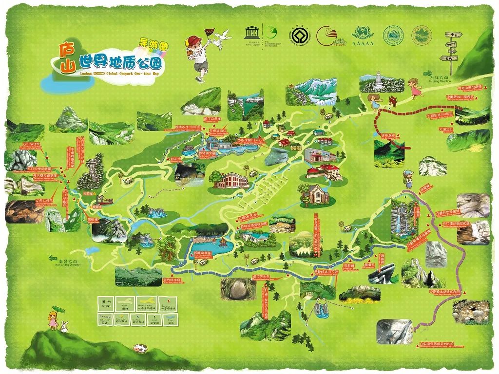 庐山世界地质公园位于江西省九江市。迄今为止,在庐山共发现一百余处重要冰川地质遗迹,完整地记录了冰雪堆积、冰川形成、冰川运动、侵蚀岩体、搬运岩石、沉积泥砾的全过程,是中国东部古气候变化和地质特征的历史记录。构造运动、冰川侵蚀、流水三种地质作用形成的复合地貌景观,也是庐山地学上的另一大特征。