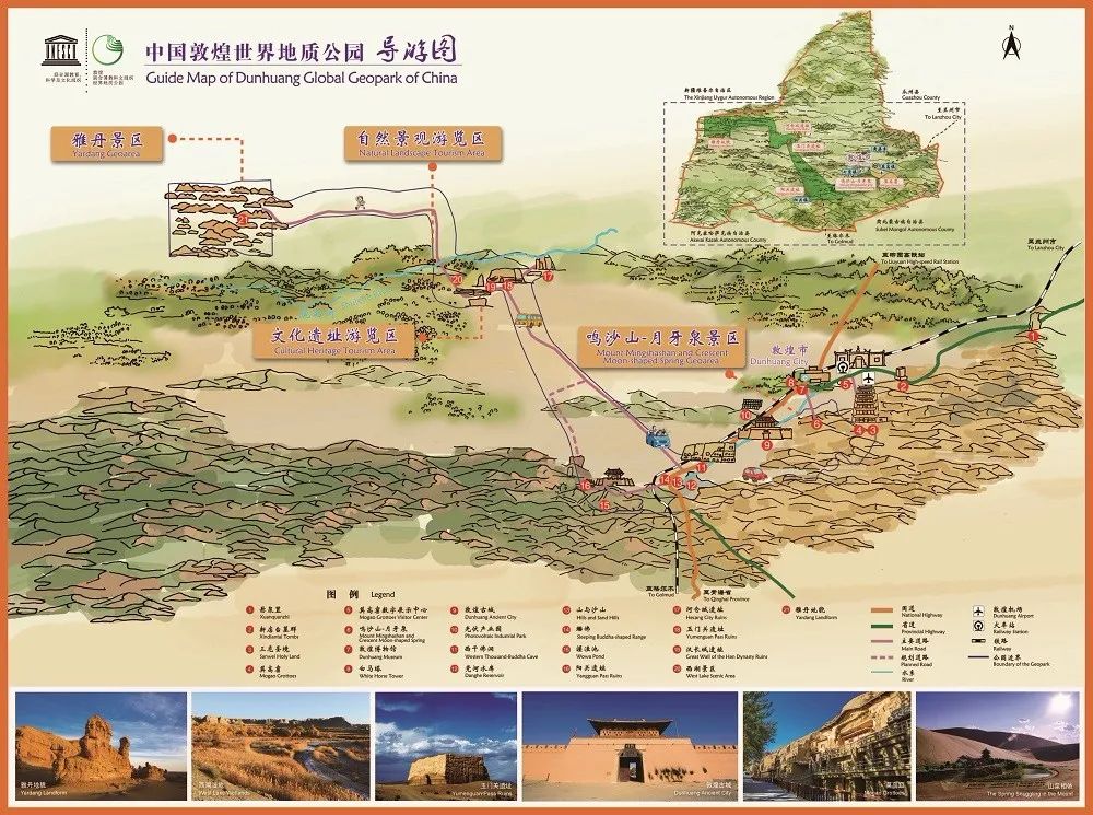 中国敦煌世界地质公园位于甘肃省敦煌市,由雅丹景区、鸣沙山月牙泉景区以及自然景观游览区和文化遗址游览区组成,面积2180.75平方公里。